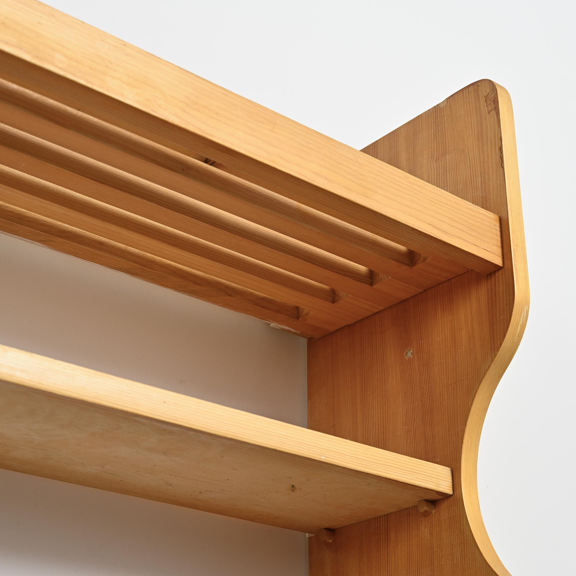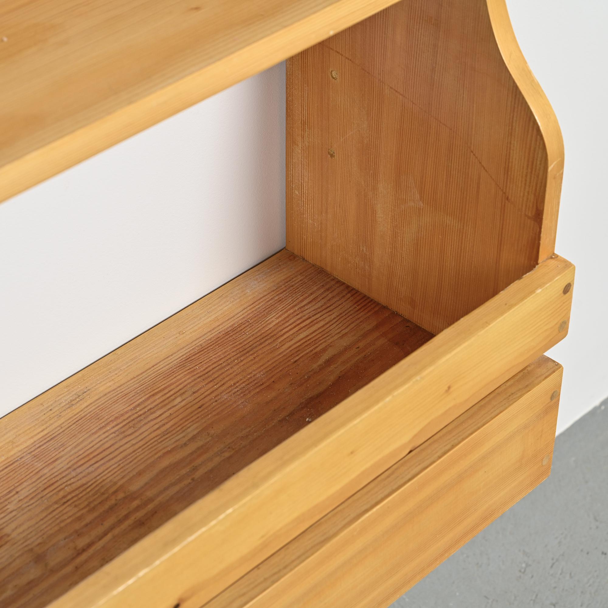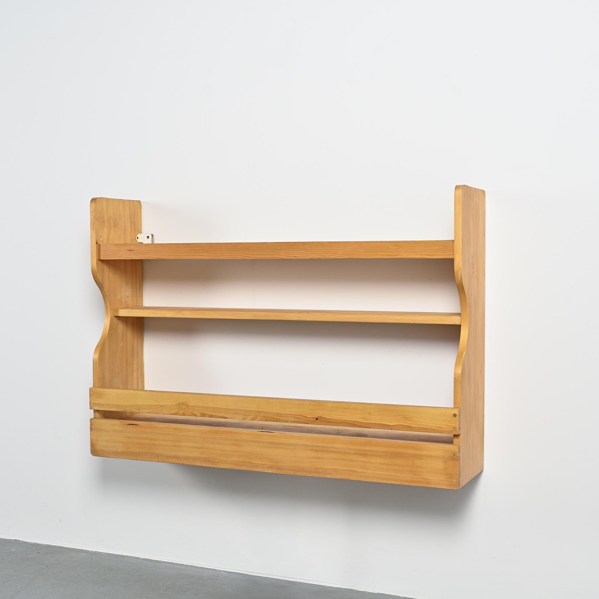 Wall mounted pine dresser created for the Les Arcs 1800 residences in the early 1970s. It features three horizontal shelves and sculpted side profiles, characteristic of the design language developed for the Belles Challes interiors.