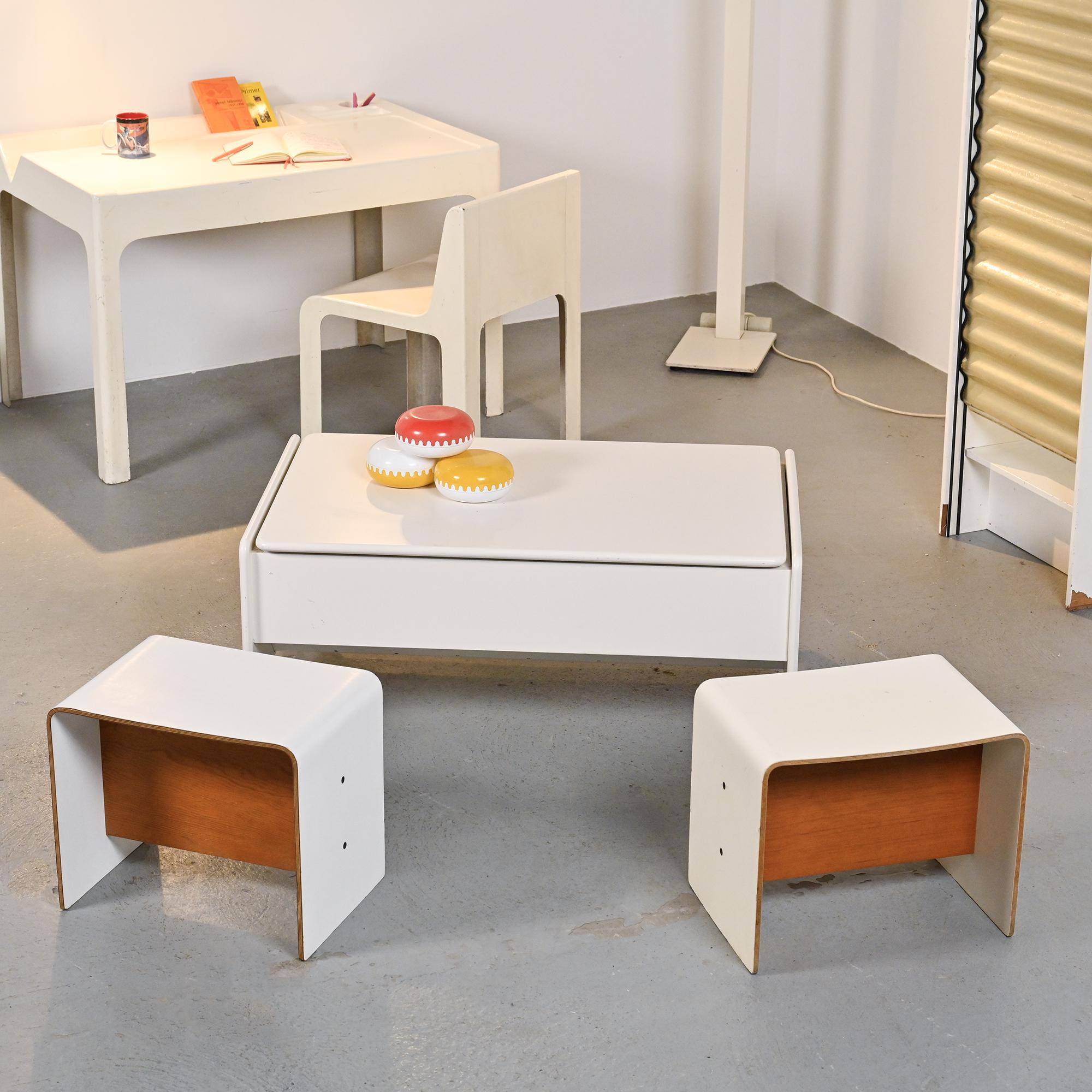 Made from U-shaped bent plywood finished with white laminate and joined by a veneered wood stretcher, these pieces embody Guariche's quest for simple, functional design suited to mountain interiors.