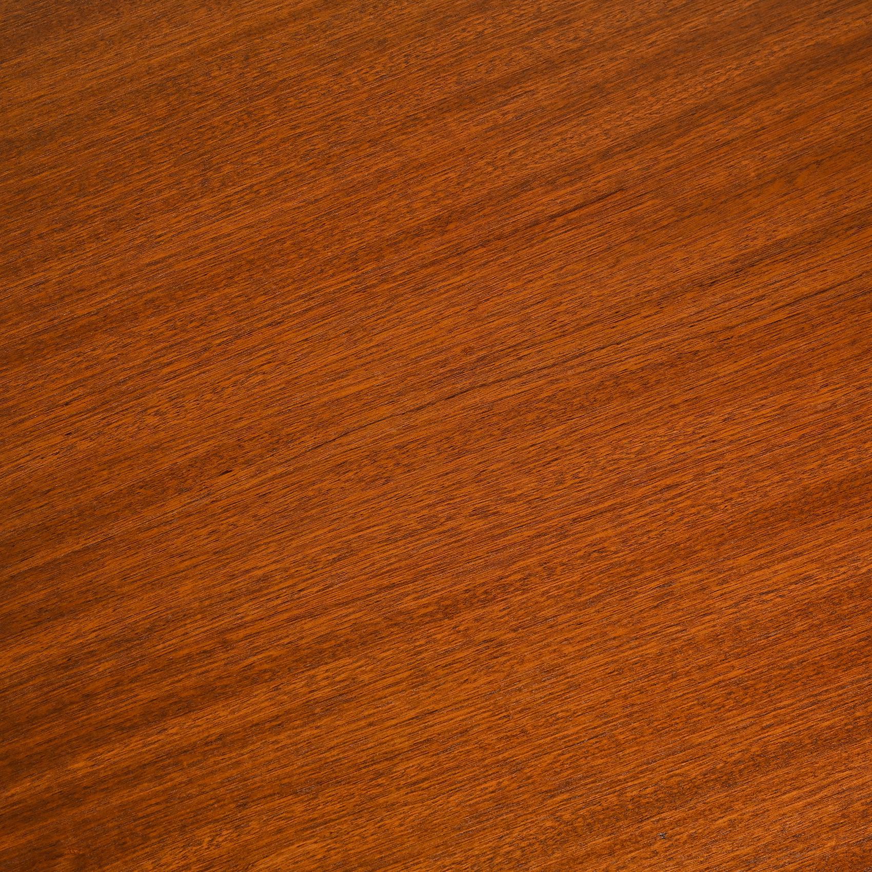 The circular mahogany top, with its deep, even grain, rests on a solid mahogany base assembled using Sornay's patented "tigette" system, his hallmark innovation. The visible mortise-and-tenon joints reveal both his constructive precision and his refined sense of proportion, characteristic of his postwar creations.