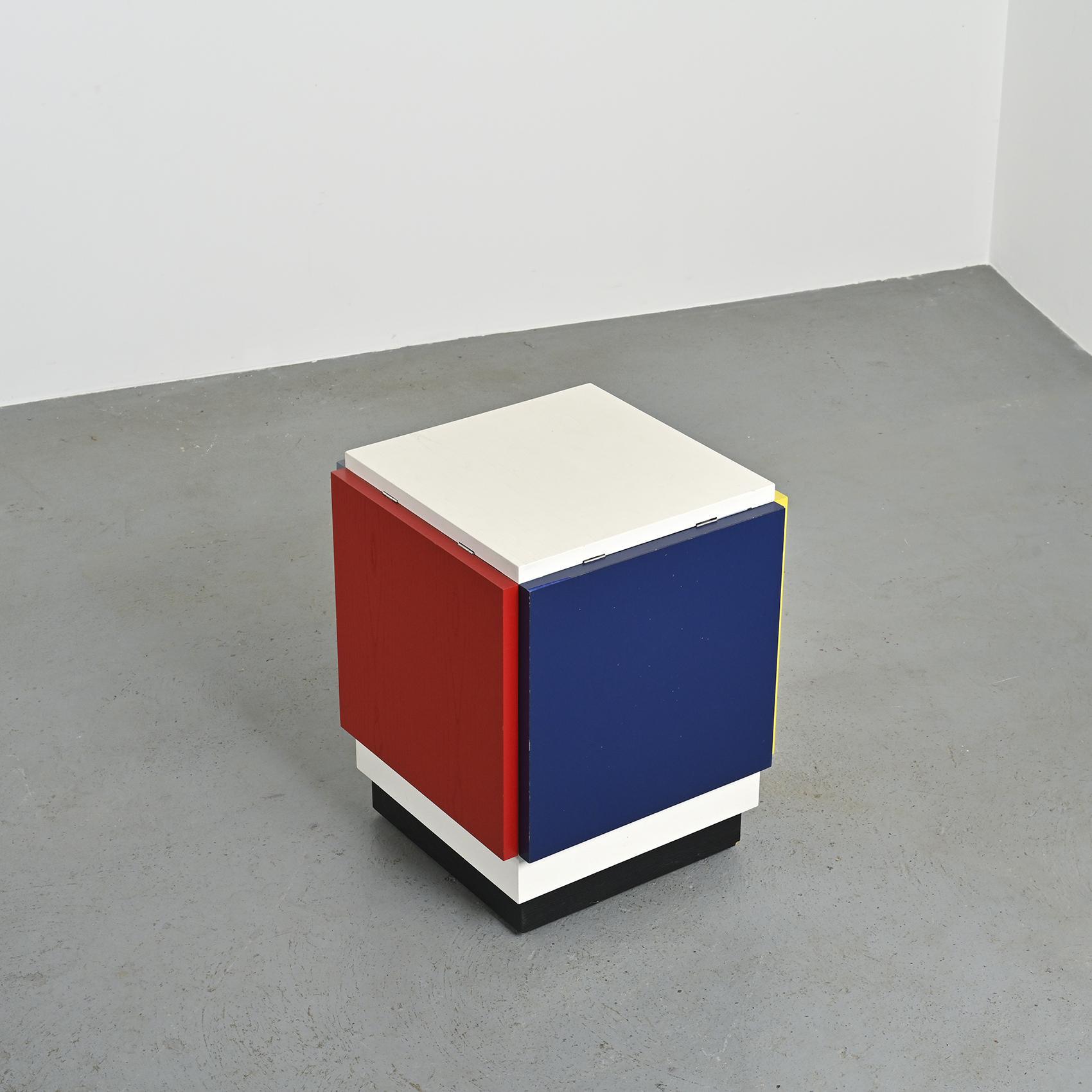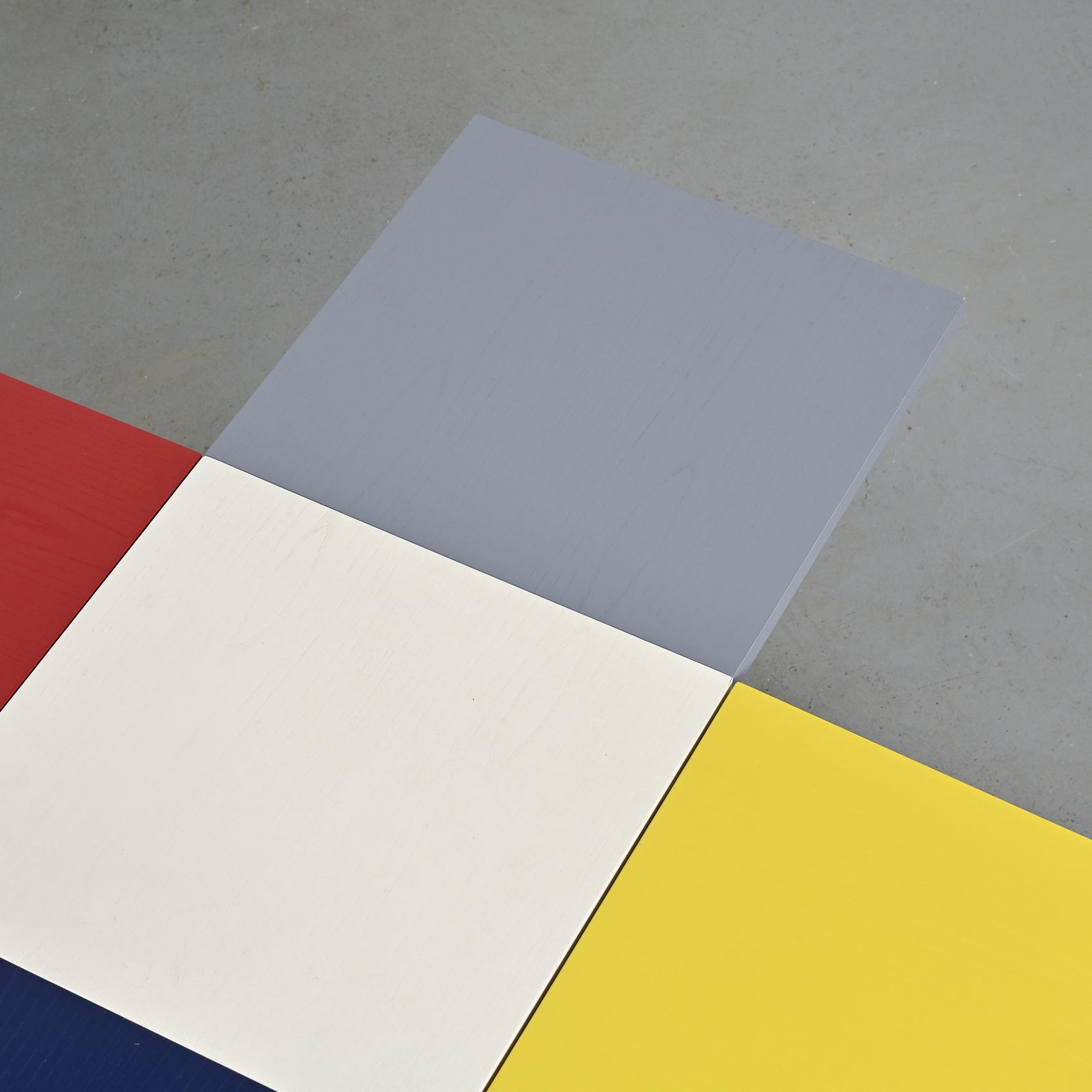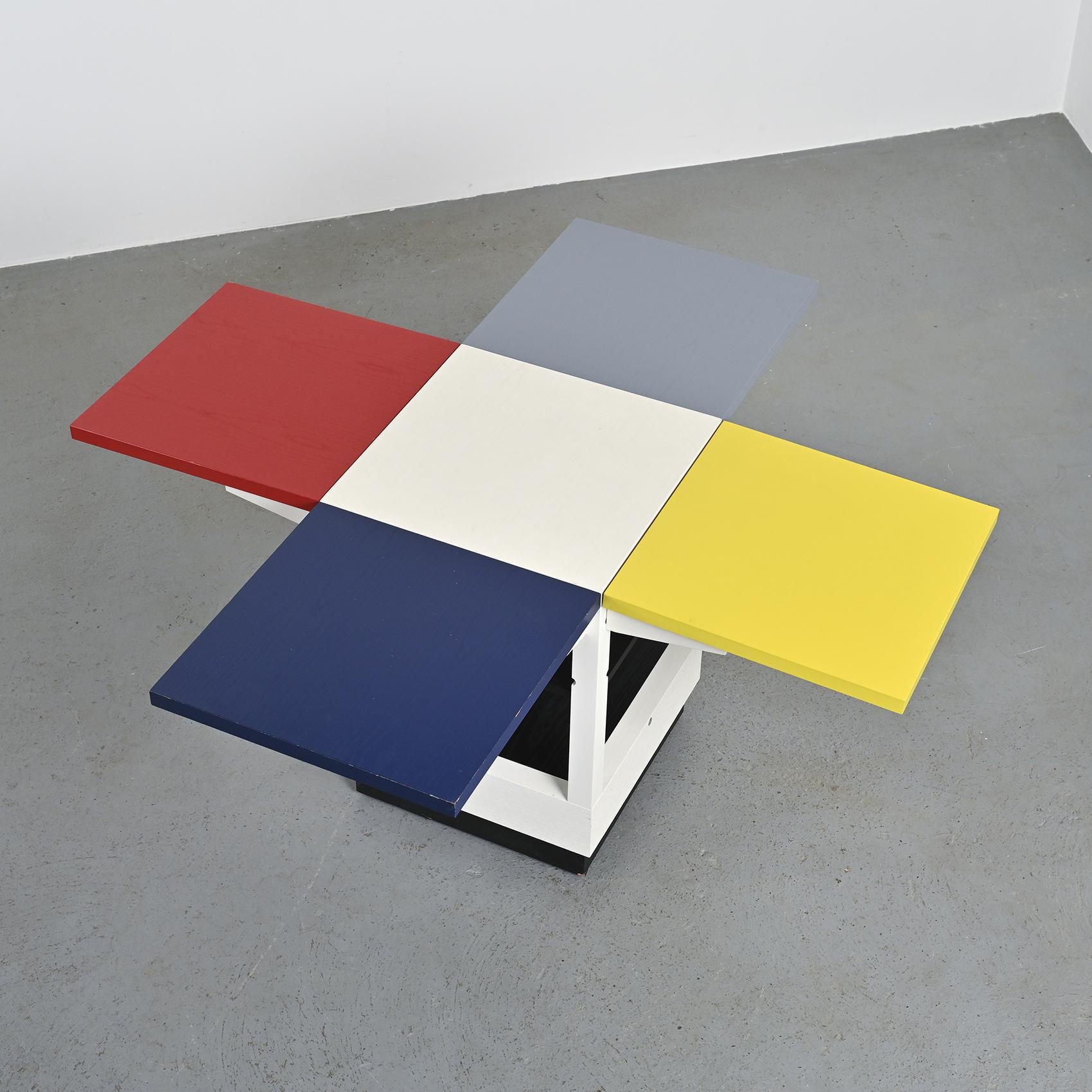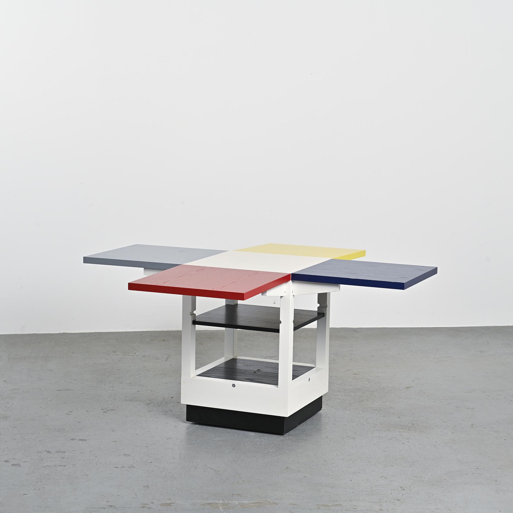 The cubic wooden structure, lacquered in white, supports four rotating tops painted in the primary colors red, blue, yellow and light grey, arranged around a central white square. This chromatic and geometric composition directly echoes the aesthetics of the De Stijl movement and the world of Piet Mondrian. With its clever system of extendable tops, the model combines function and artistic expression, in line with Tecta's modernist explorations.