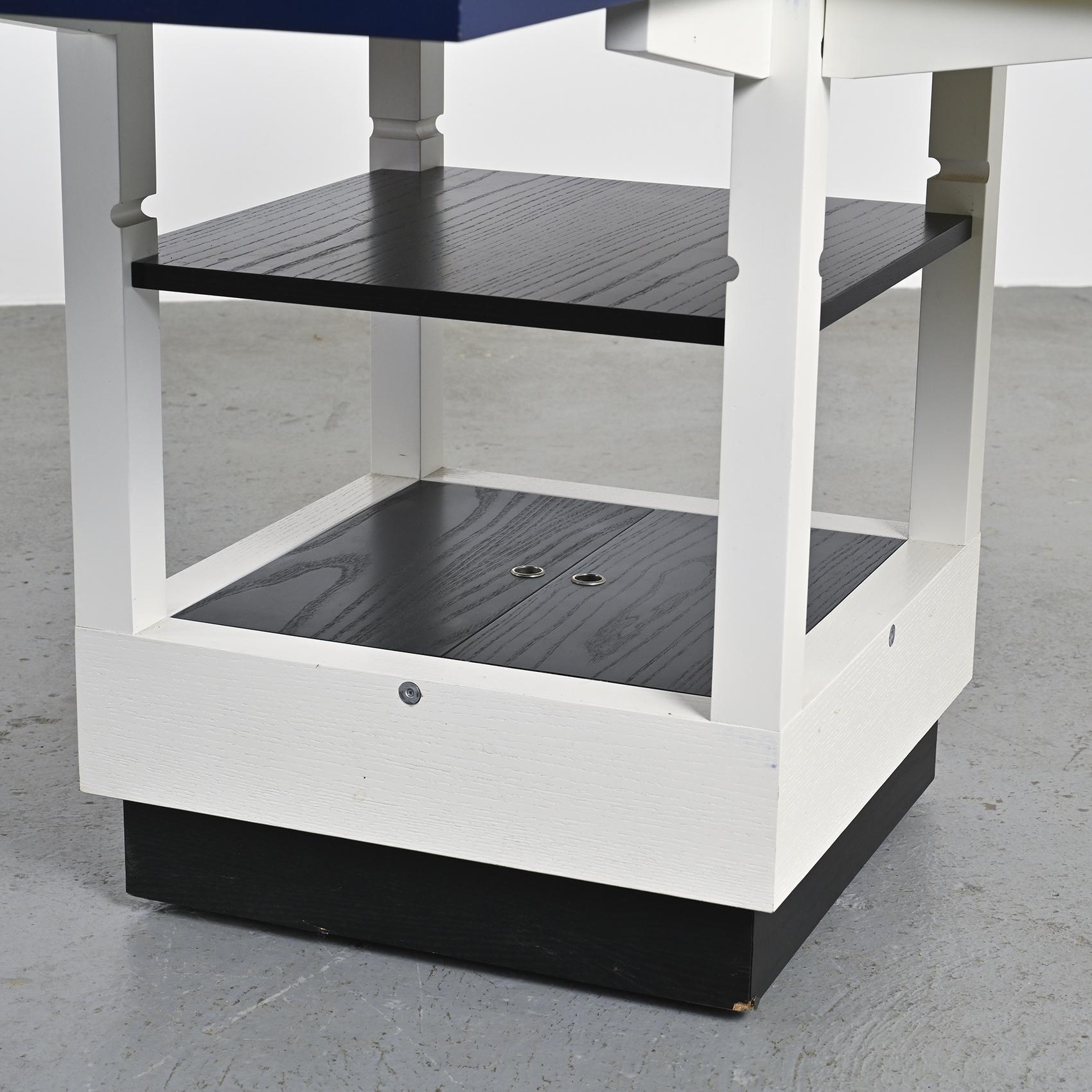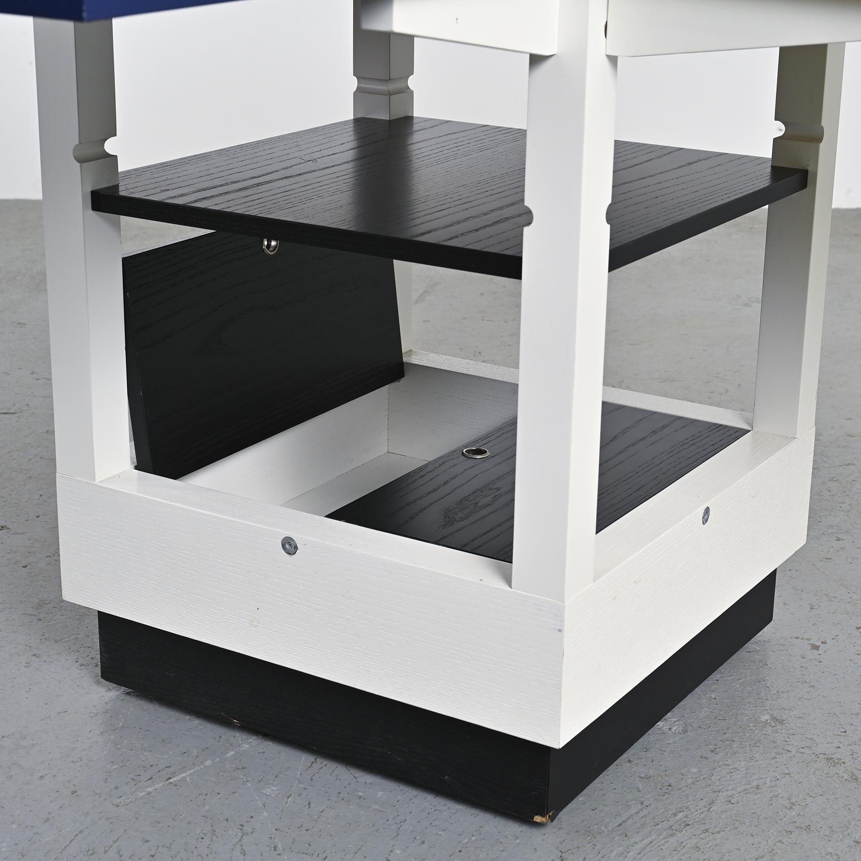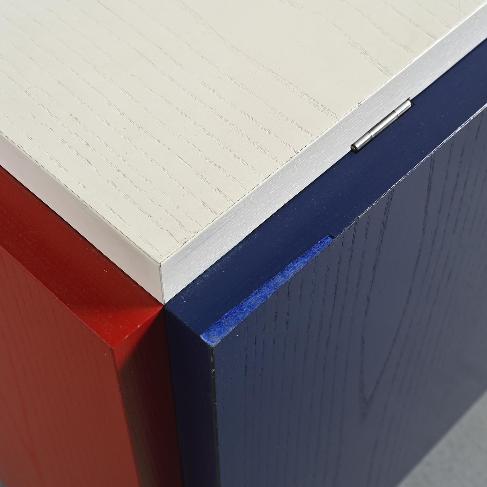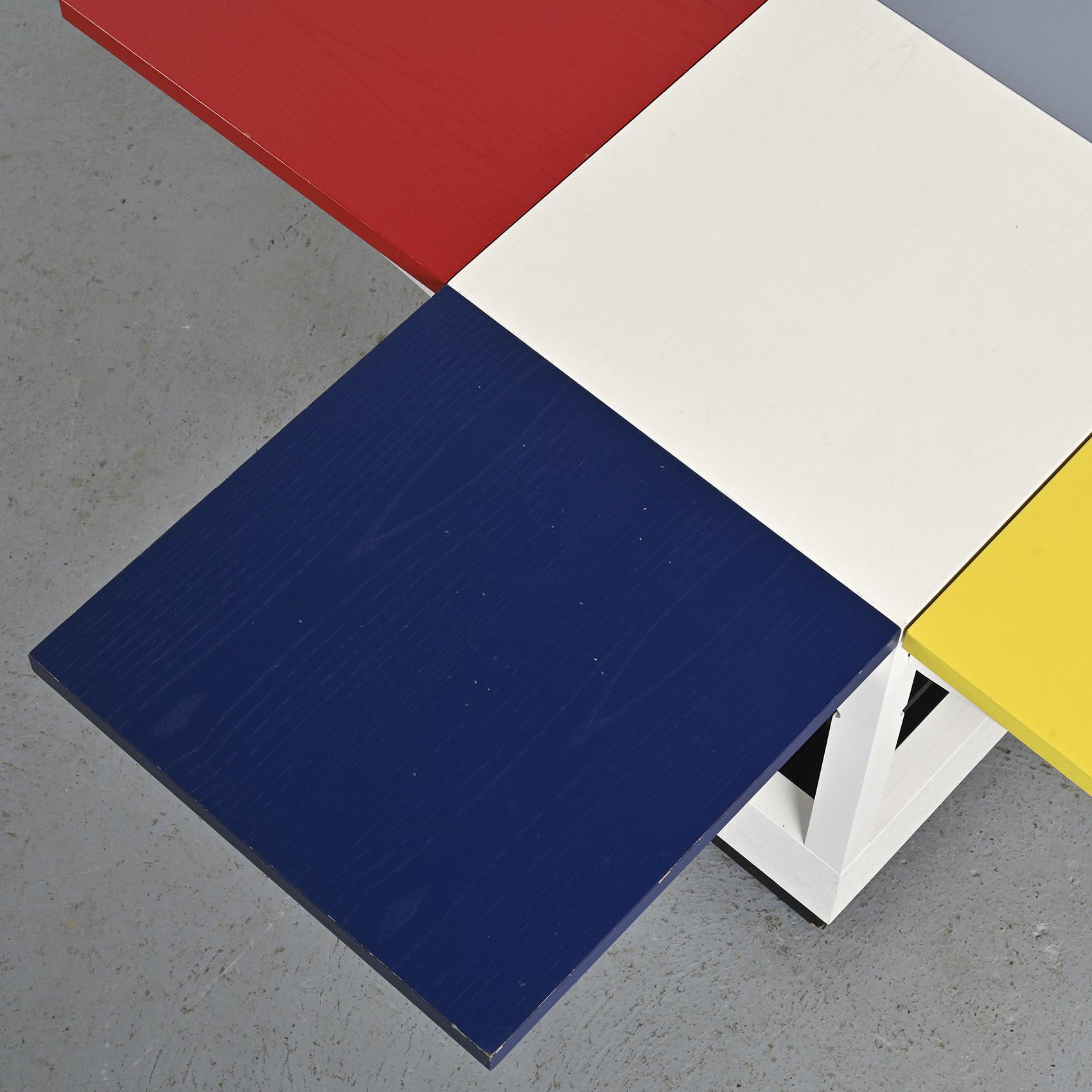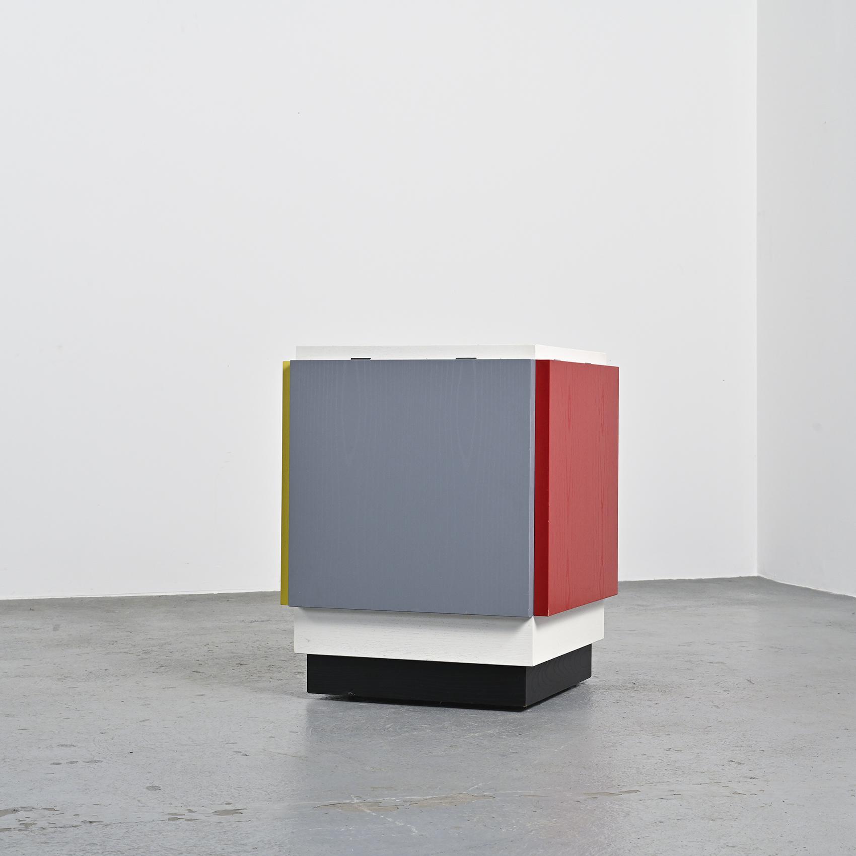 The cubic wooden structure, lacquered in white, supports four rotating tops painted in the primary colors red, blue, yellow and light grey, arranged around a central white square. This chromatic and geometric composition directly echoes the aesthetics of the De Stijl movement and the world of Piet Mondrian. With its clever system of extendable tops, the model combines function and artistic expression, in line with Tecta's modernist explorations.