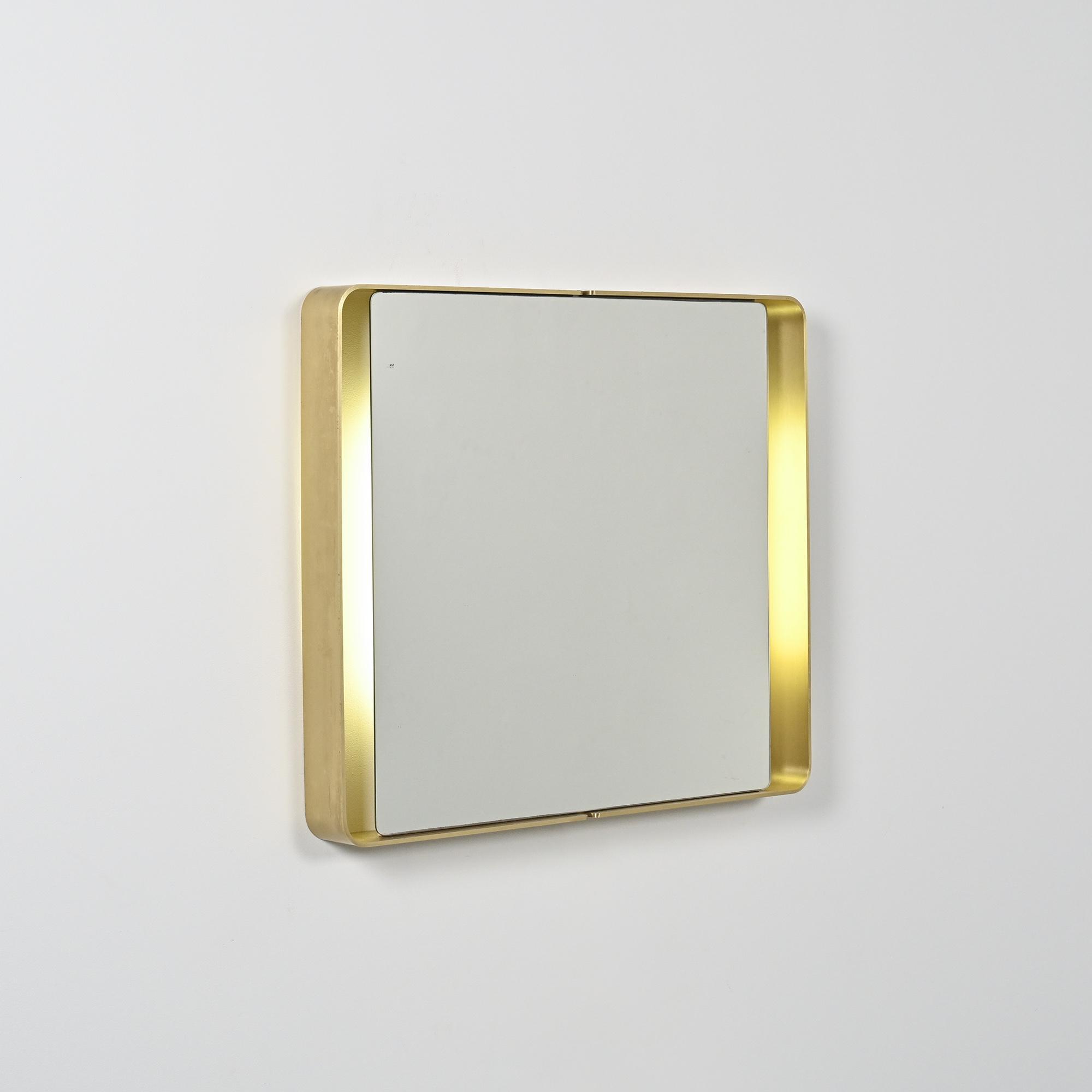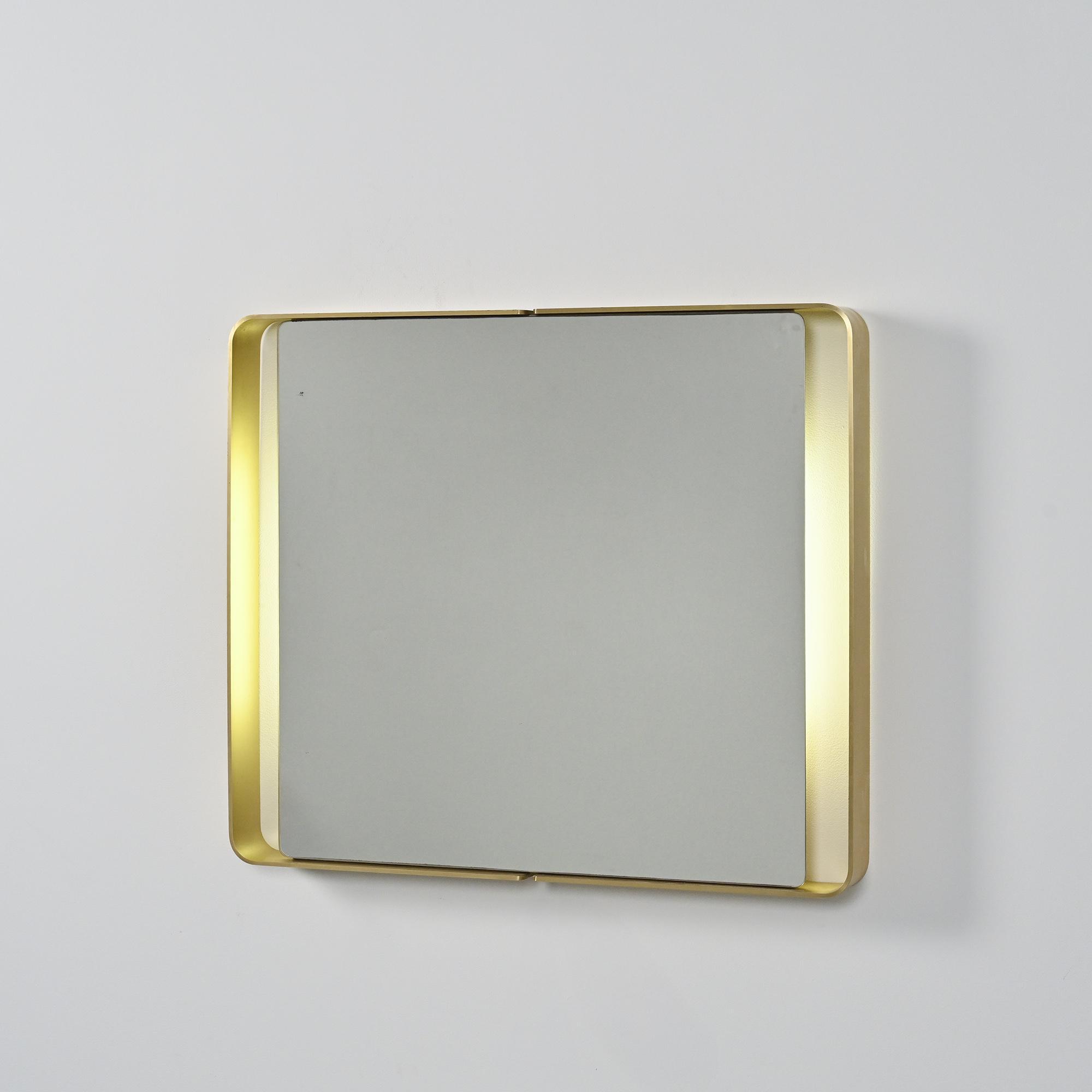 Miroir rectangulaire des années 1970, entouré d'un cadre en métal doré plié formant un contour continu et arrondi sur les angles.