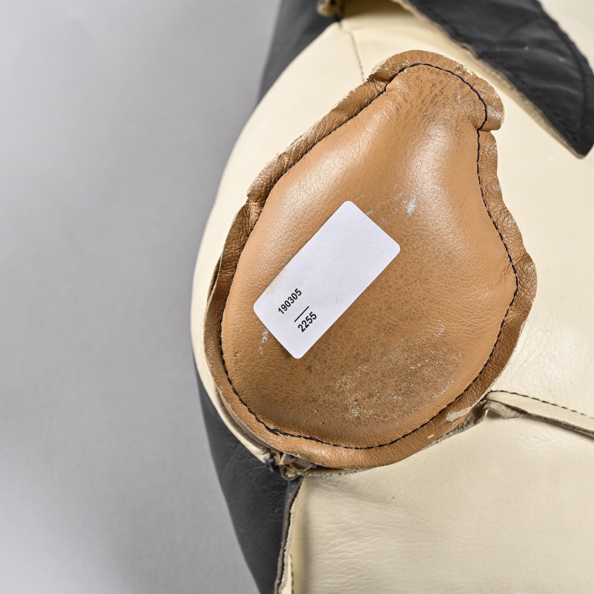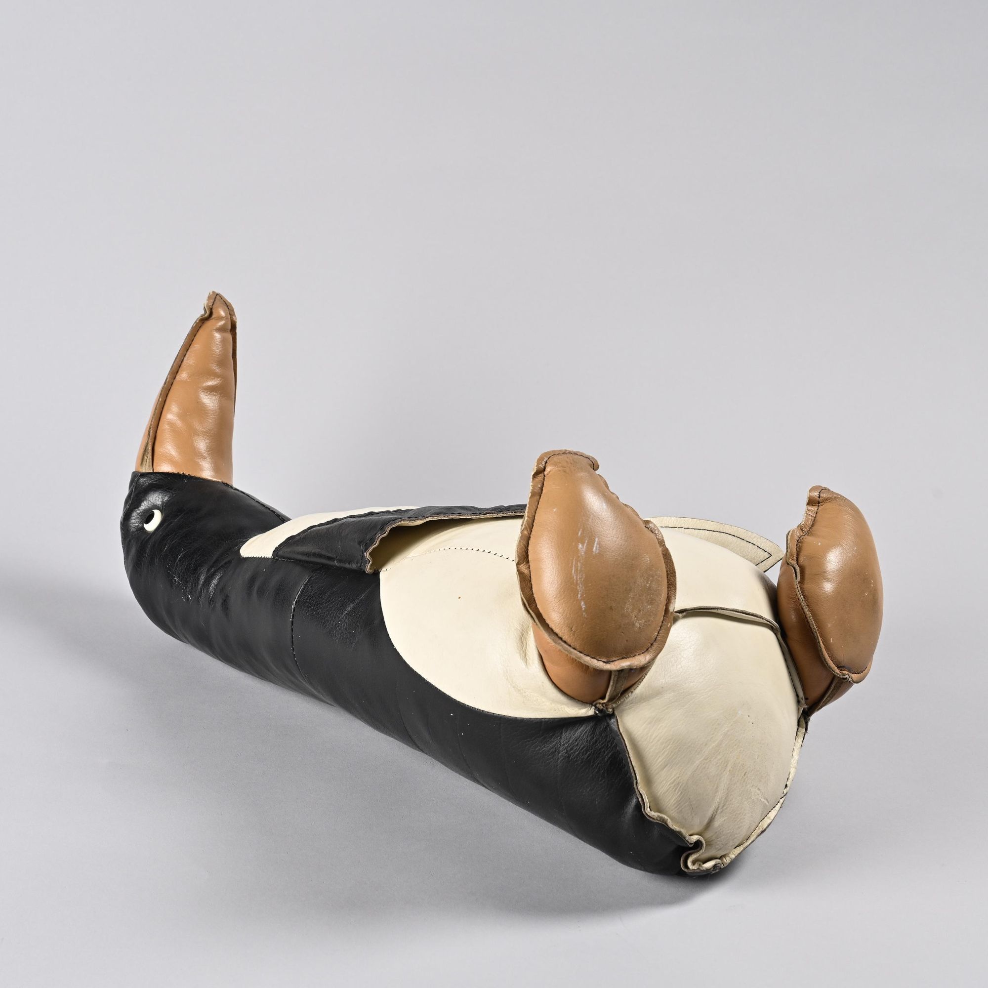 Ce charmant animal est composé de panneaux de cuir noir, crème et camel, assemblés par surpiqûres apparentes. Les yeux en sulfure de verre ajoutent une touche réaliste et ludique à cette pièce décorative typique du design animalier de la période. À mi-chemin entre objet d'artisanat et sculpture de salon, il incarne l'esprit fantaisiste et chaleureux du mobilier décoratif des années 1970.