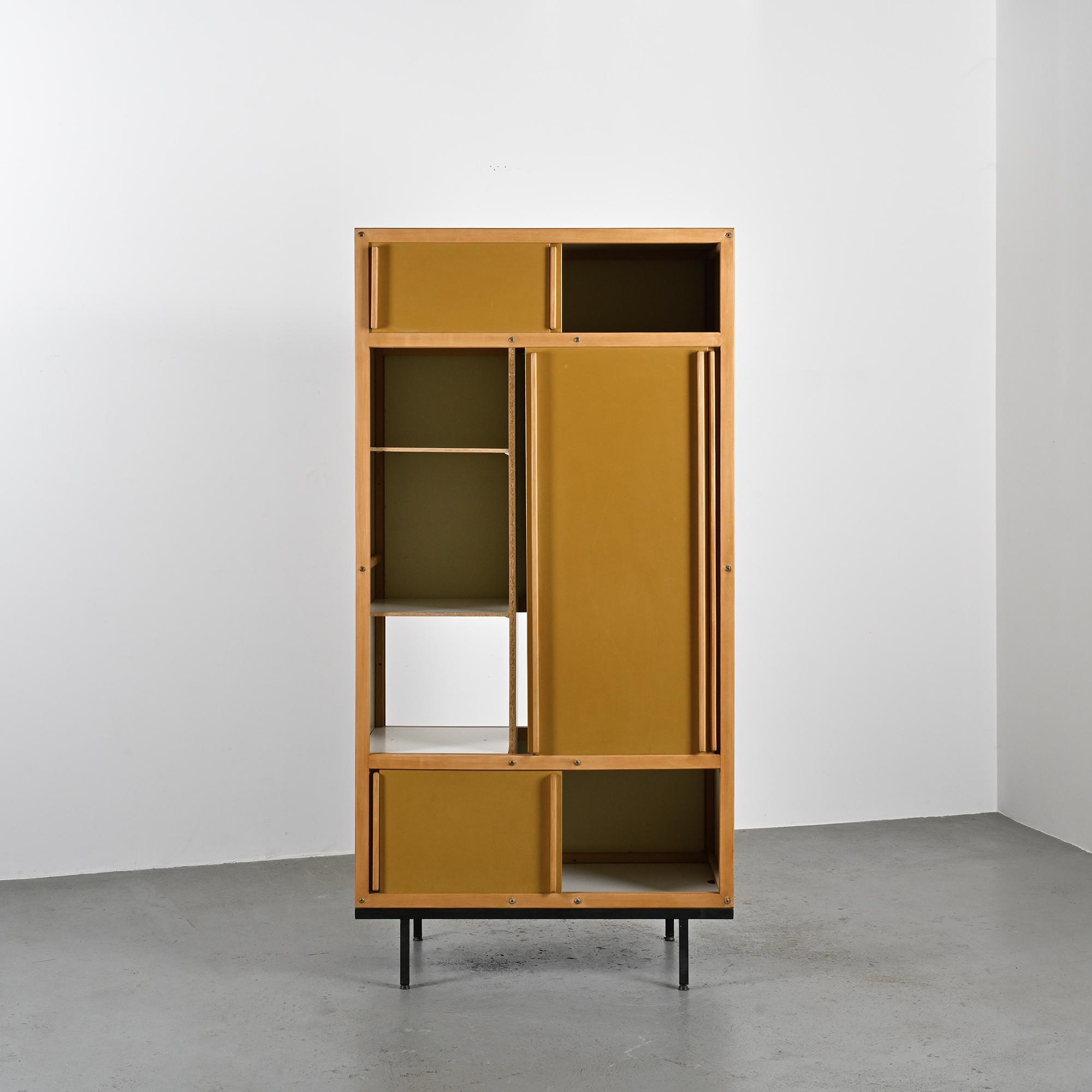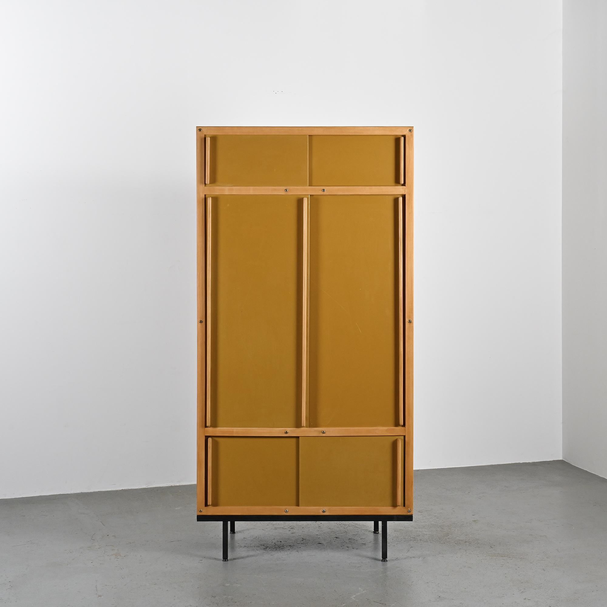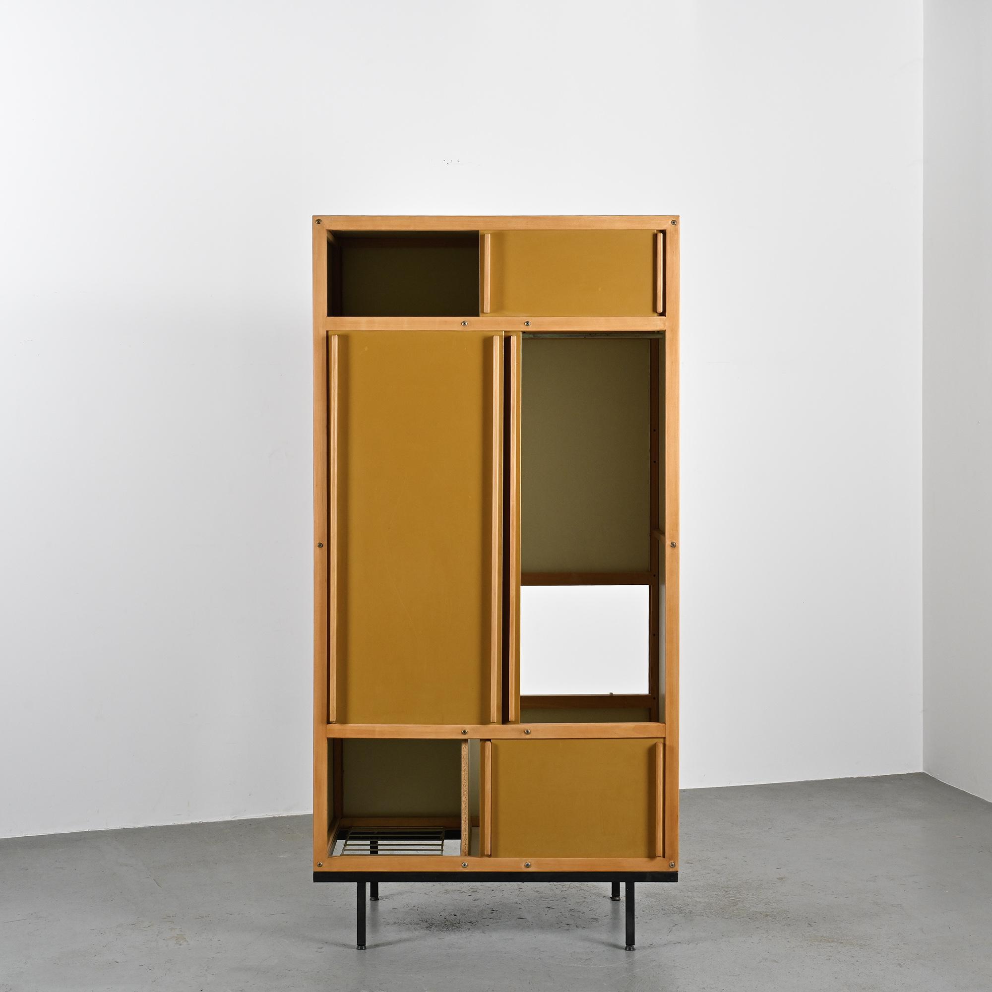 Reposant sur un piétement en métal laqué noir à section carrée, le meuble présente un cadre en hêtre teinté foncé accueillant des portes coulissantes laquées d'origine, dans une palette de noir, crème et gris très clair. L'intérieur est organisé avec une penderie sur la partie droite et un ensemble d'étagères sur la gauche. L'ensemble illustre la rigueur constructive et le sens de la composition propres au travail de Sornay, associant bois précieux, métal et laque dans un langage fonctionnel et épuré.