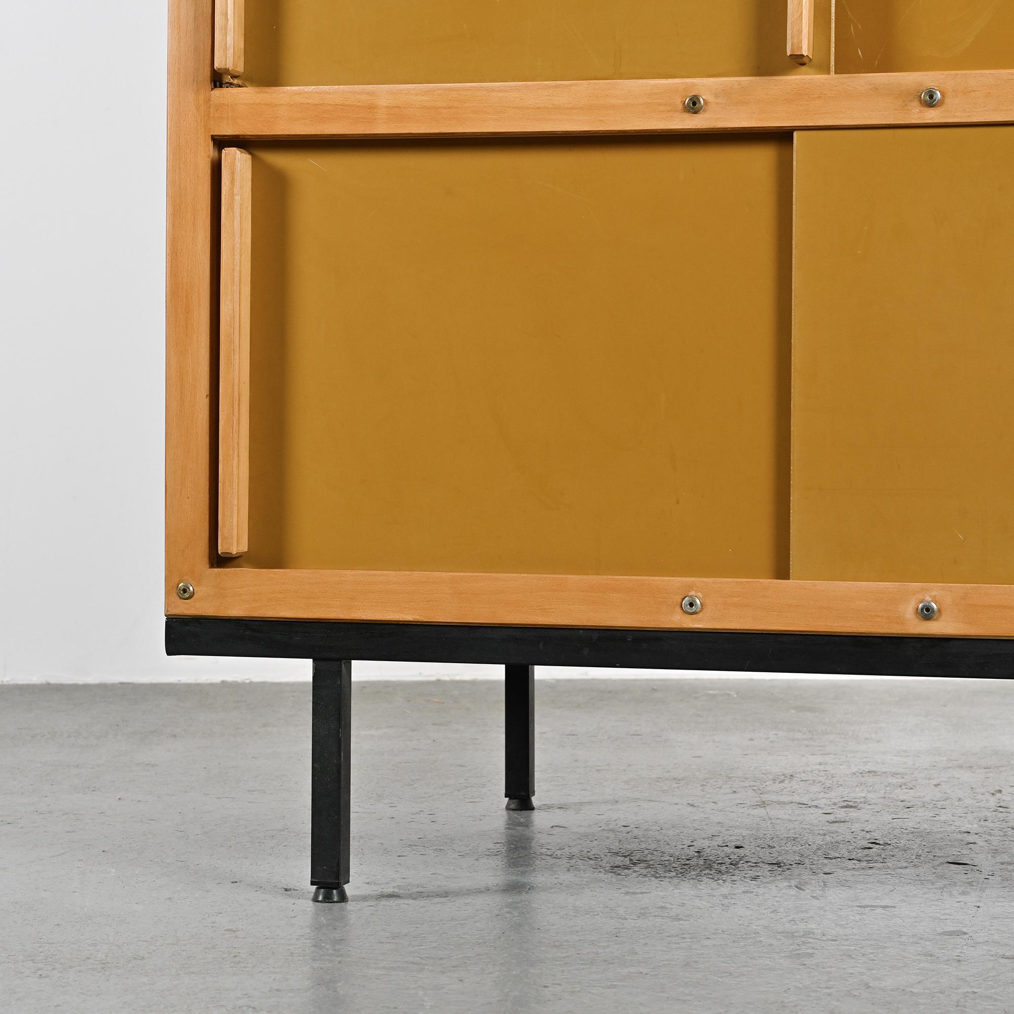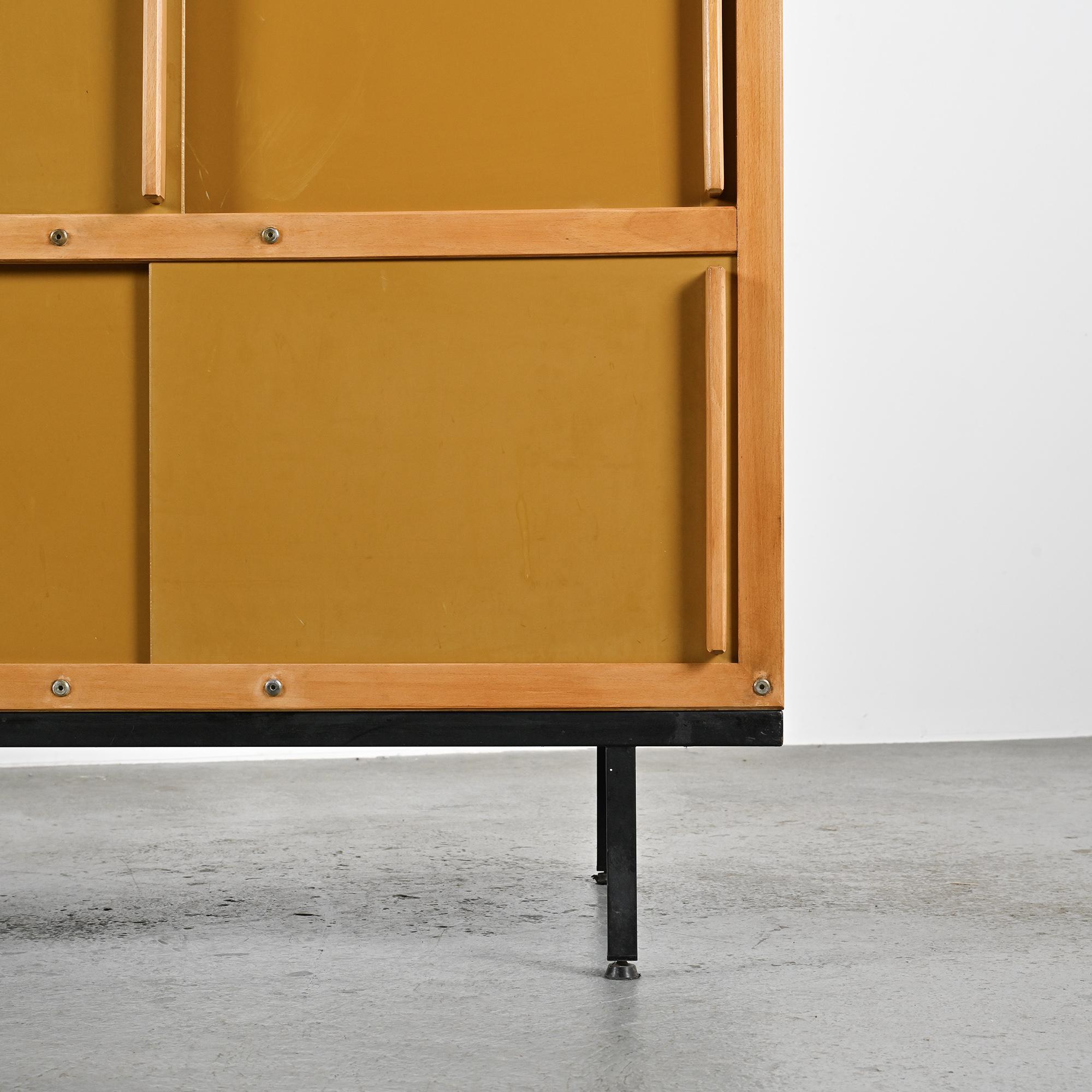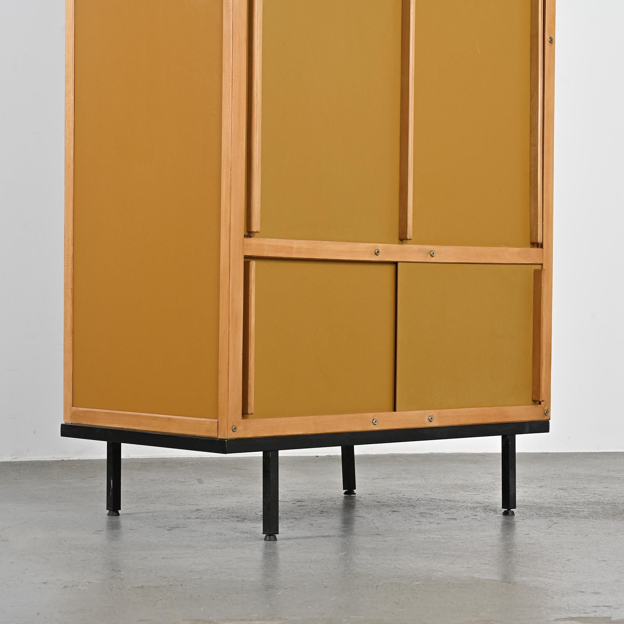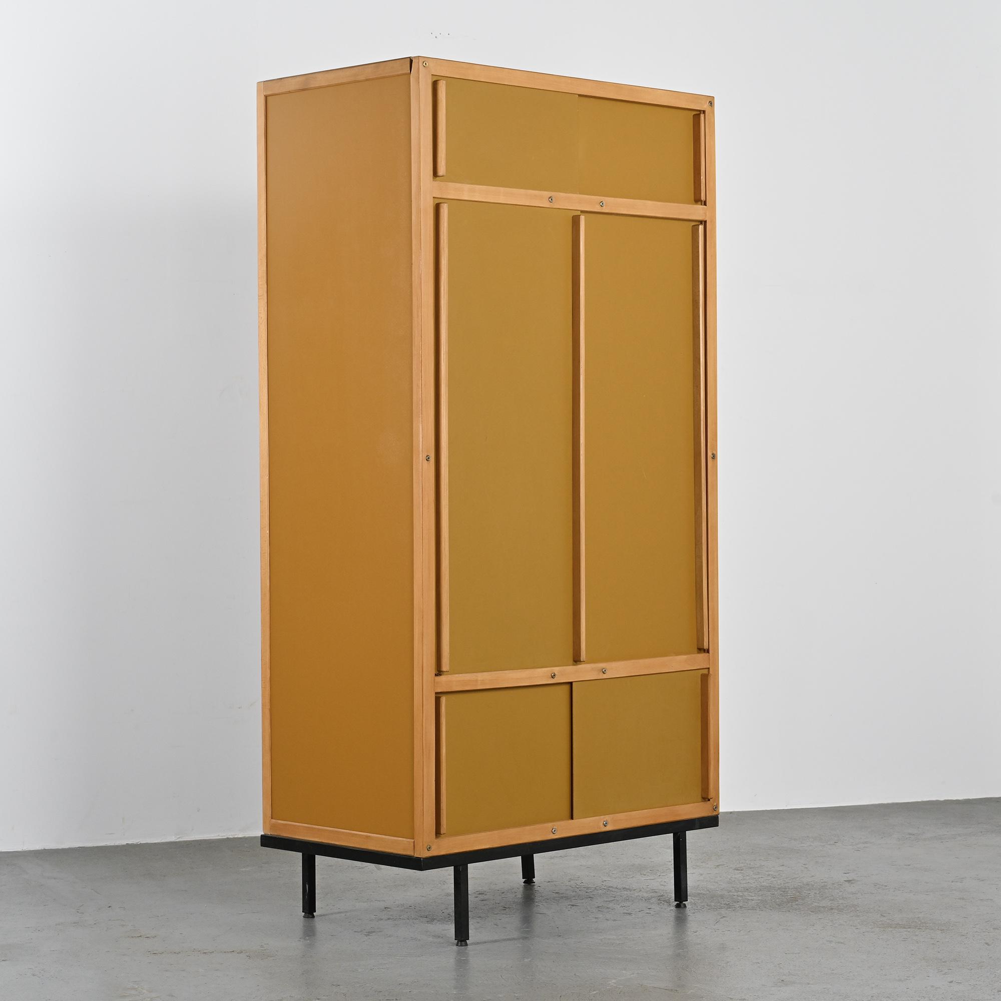 Reposant sur un piétement en métal laqué noir à section carrée, le meuble présente un cadre en hêtre teinté foncé accueillant des portes coulissantes laquées d'origine, dans une palette de noir, crème et gris très clair. L'intérieur est organisé avec une penderie sur la partie droite et un ensemble d'étagères sur la gauche. L'ensemble illustre la rigueur constructive et le sens de la composition propres au travail de Sornay, associant bois précieux, métal et laque dans un langage fonctionnel et épuré.