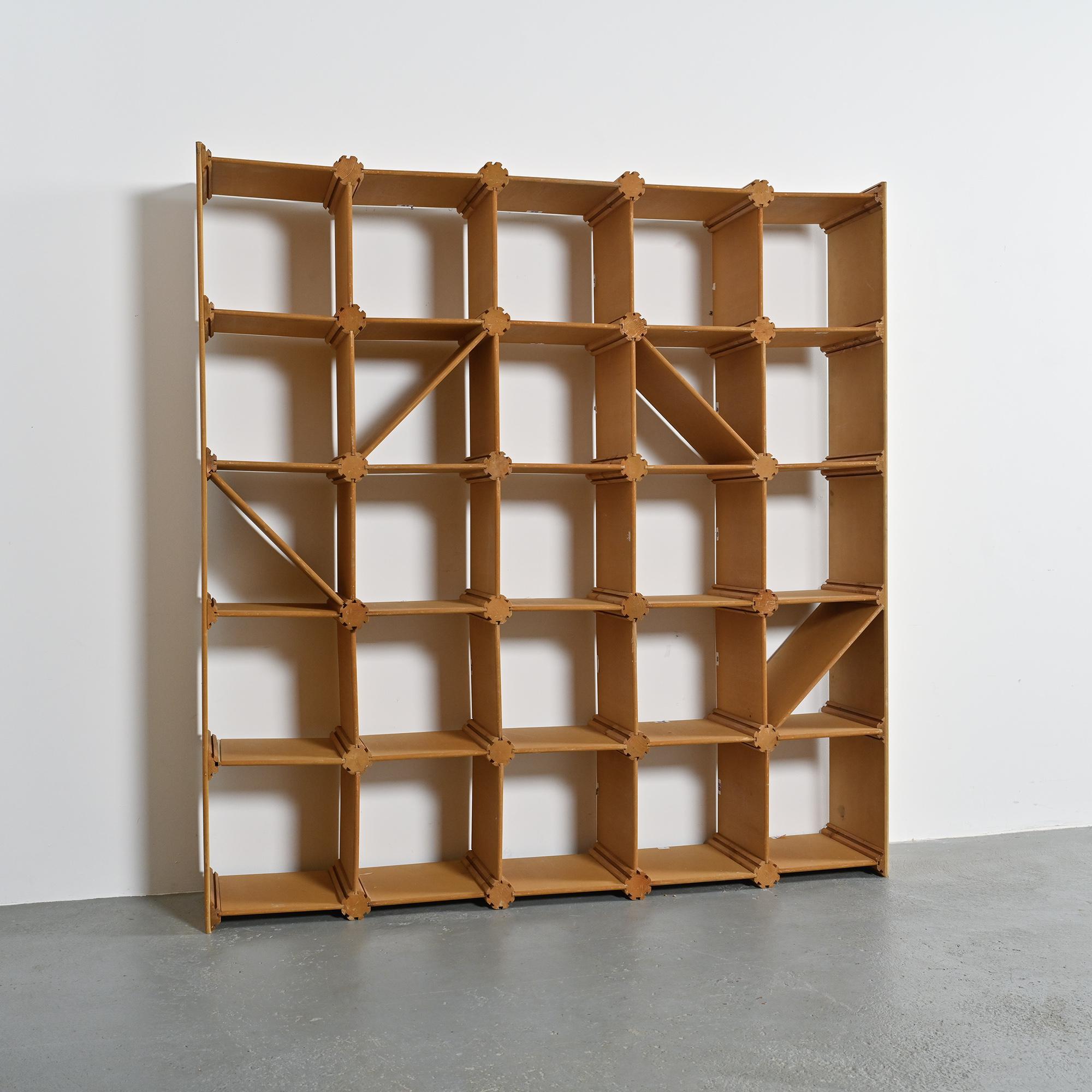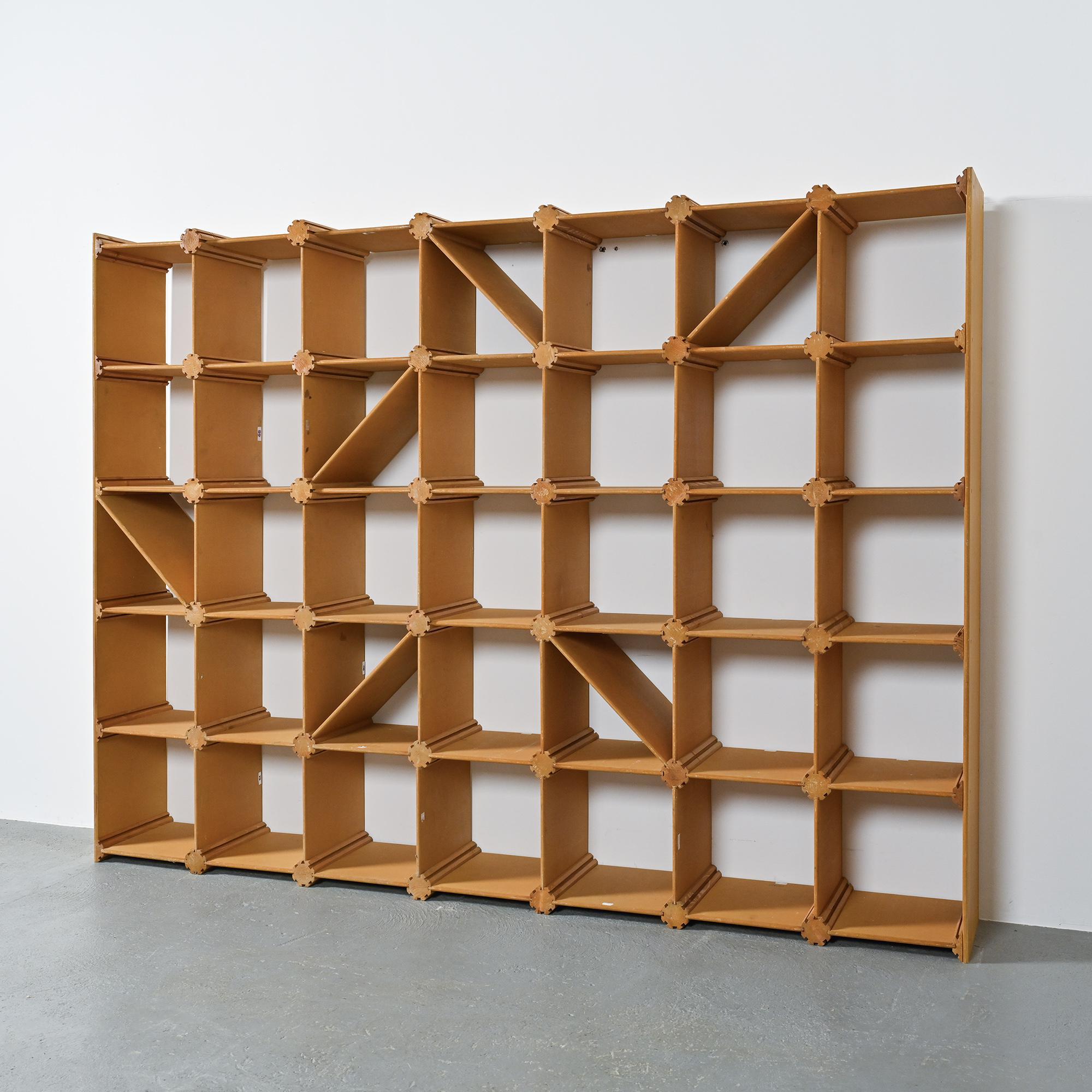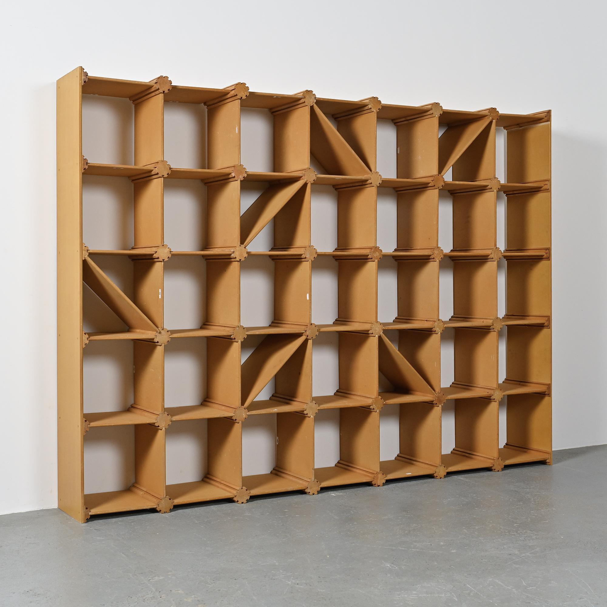 La structure est composée de cases carrées assemblées par des éléments circulaires de jonction caractéristiques, permettant un montage répétitif et évolutif. Les compartiments accueillent des tablettes droites ou inclinées, initialement prévues pour le stockage des bouteilles. L'ensemble repose sur un système autoportant, dont la géométrie régulière évoque les recherches modulaires du design des années 1970.