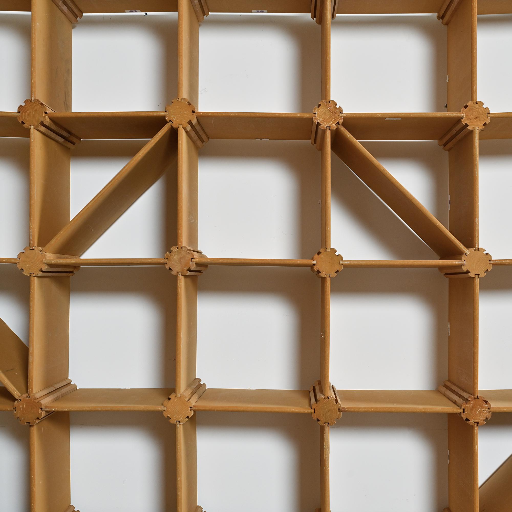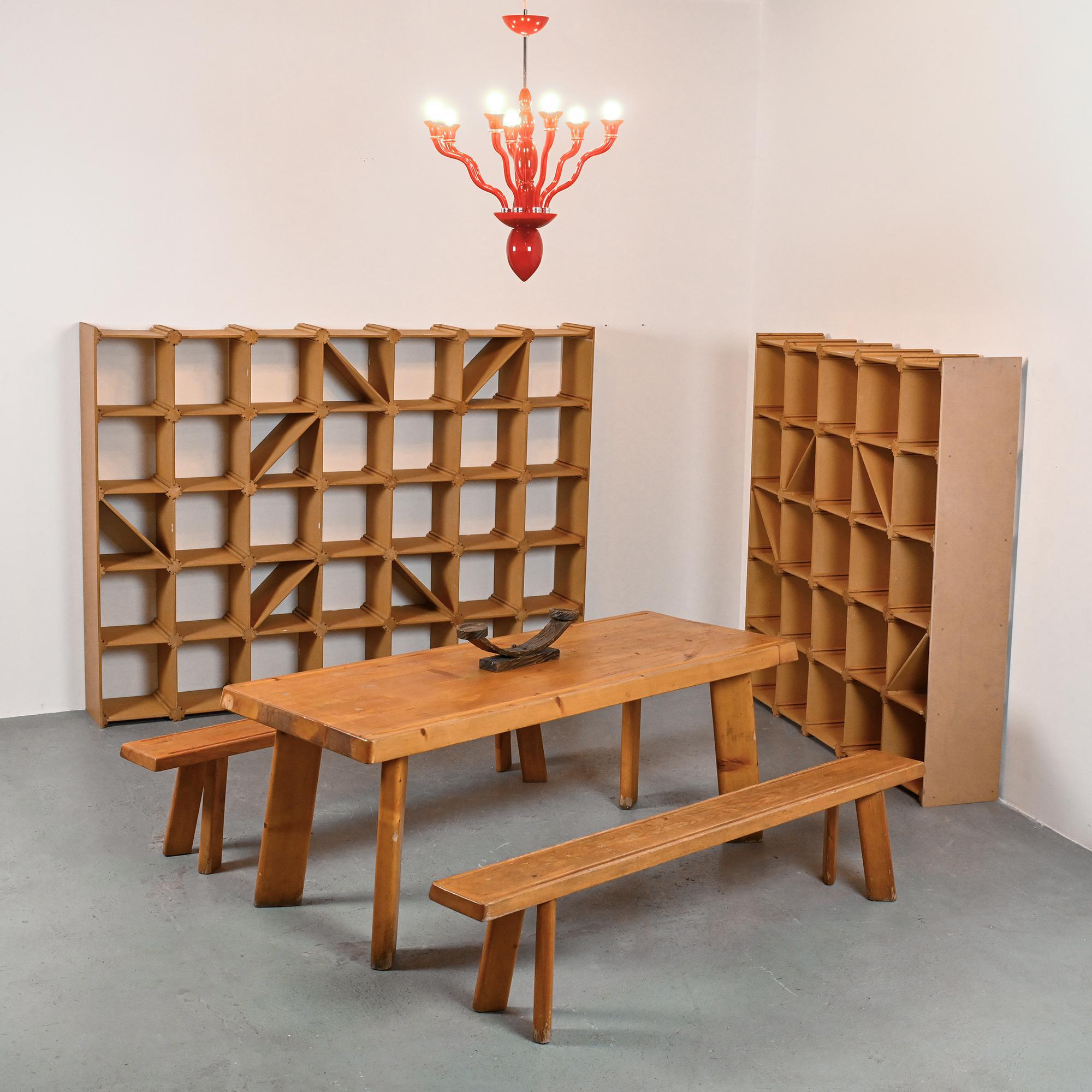 Détourné de sa fonction première, ce module peut également faire office de bibliothèque ou de meuble de rangement graphique, grâce à son rythme architectural marqué et à la chaleur du pin massif.