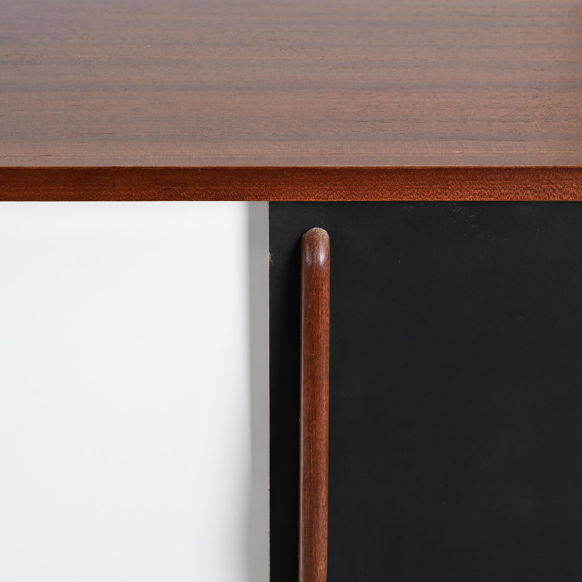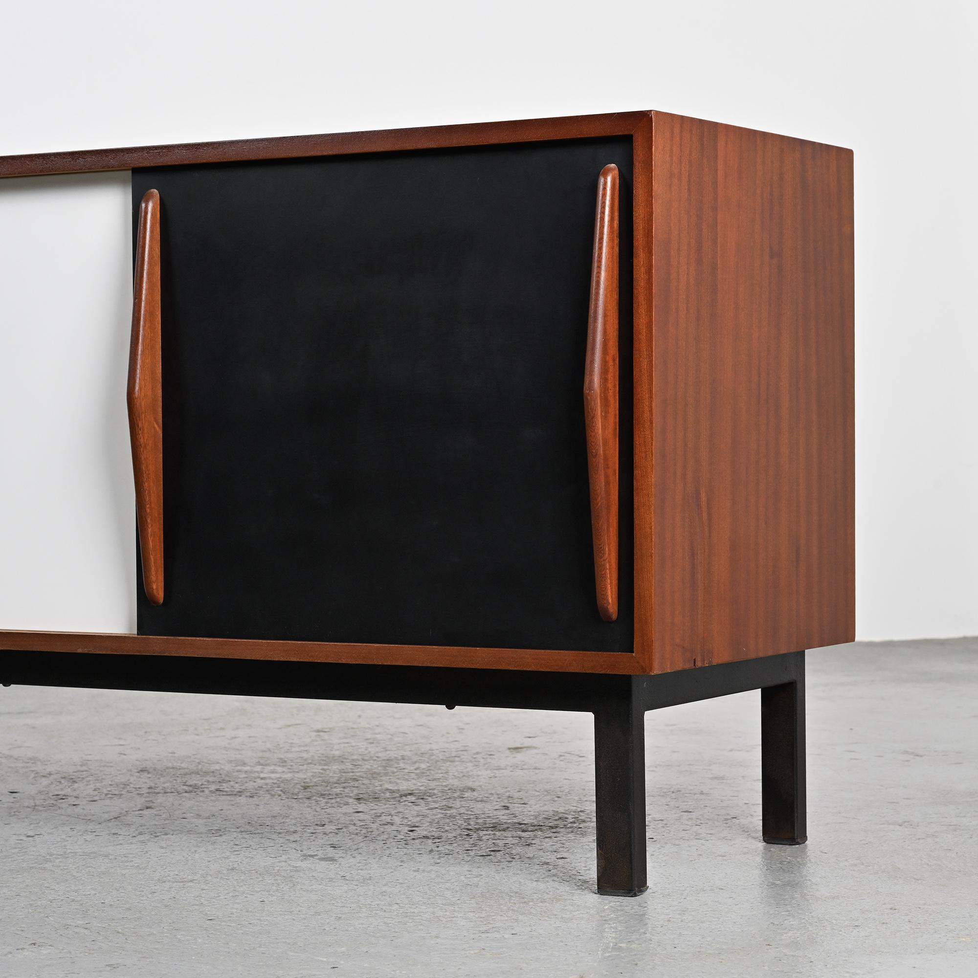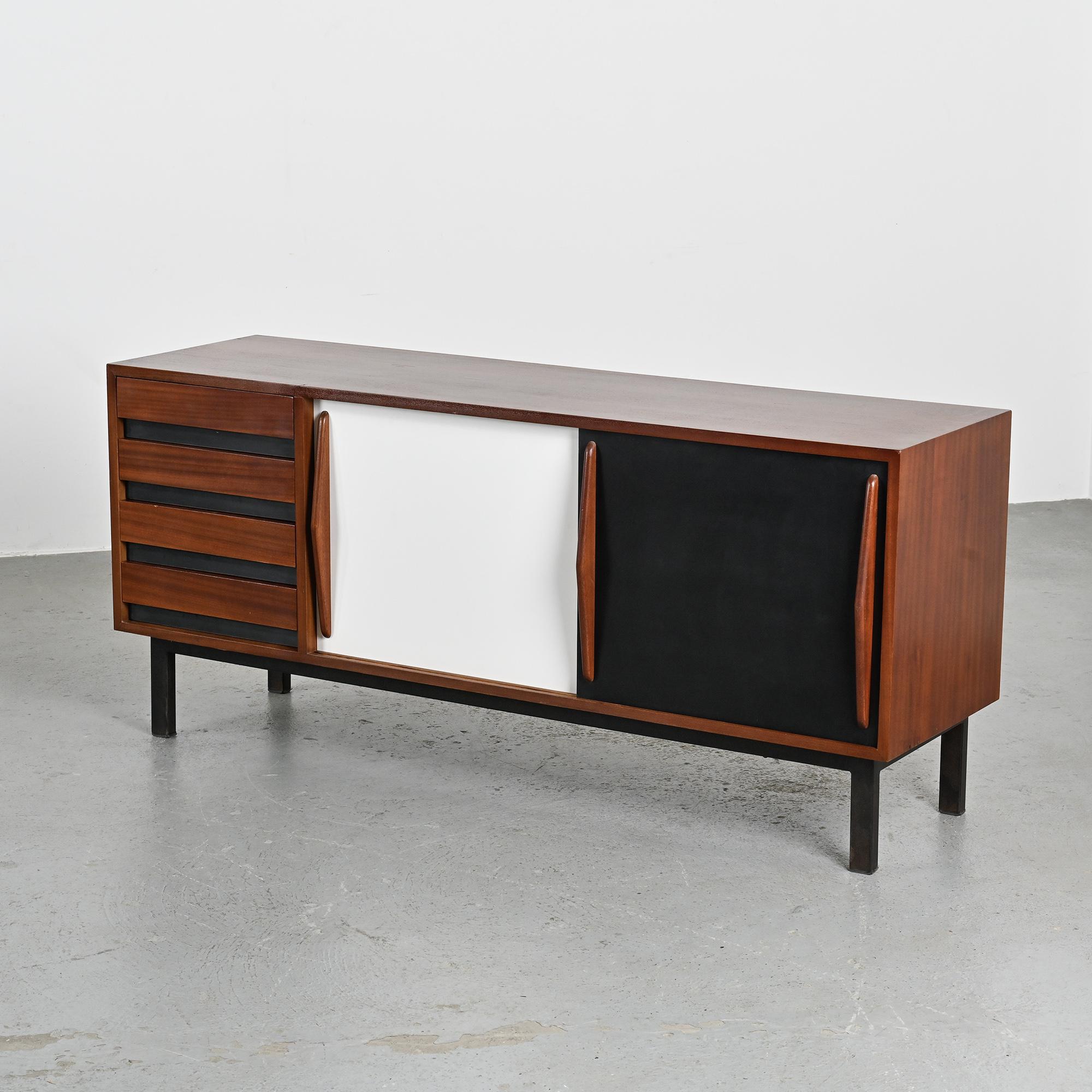 Imaginée pour la ville minière de Cansado en Mauritanie, cette enfilade incarne la rigueur fonctionnelle et l'élégance épurée propres à Charlotte Perriand. Sa structure en placage d'acajou accueille deux portes coulissantes contrastées, l'une blanche, l'autre noire, accompagnées de quatre tiroirs latéraux. L'ensemble repose sur un piétement métallique laqué noir, conférant légèreté et modernité à la pièce.