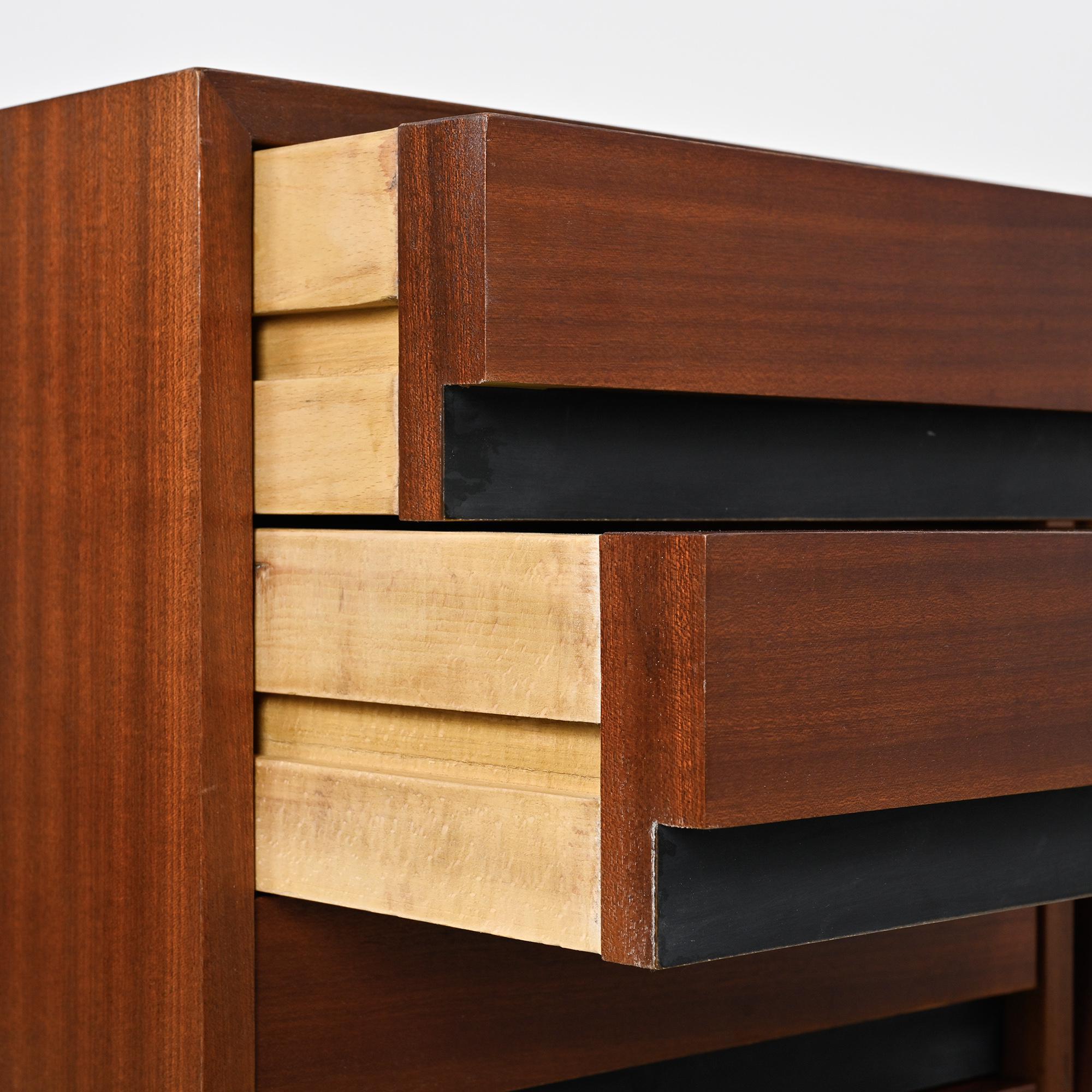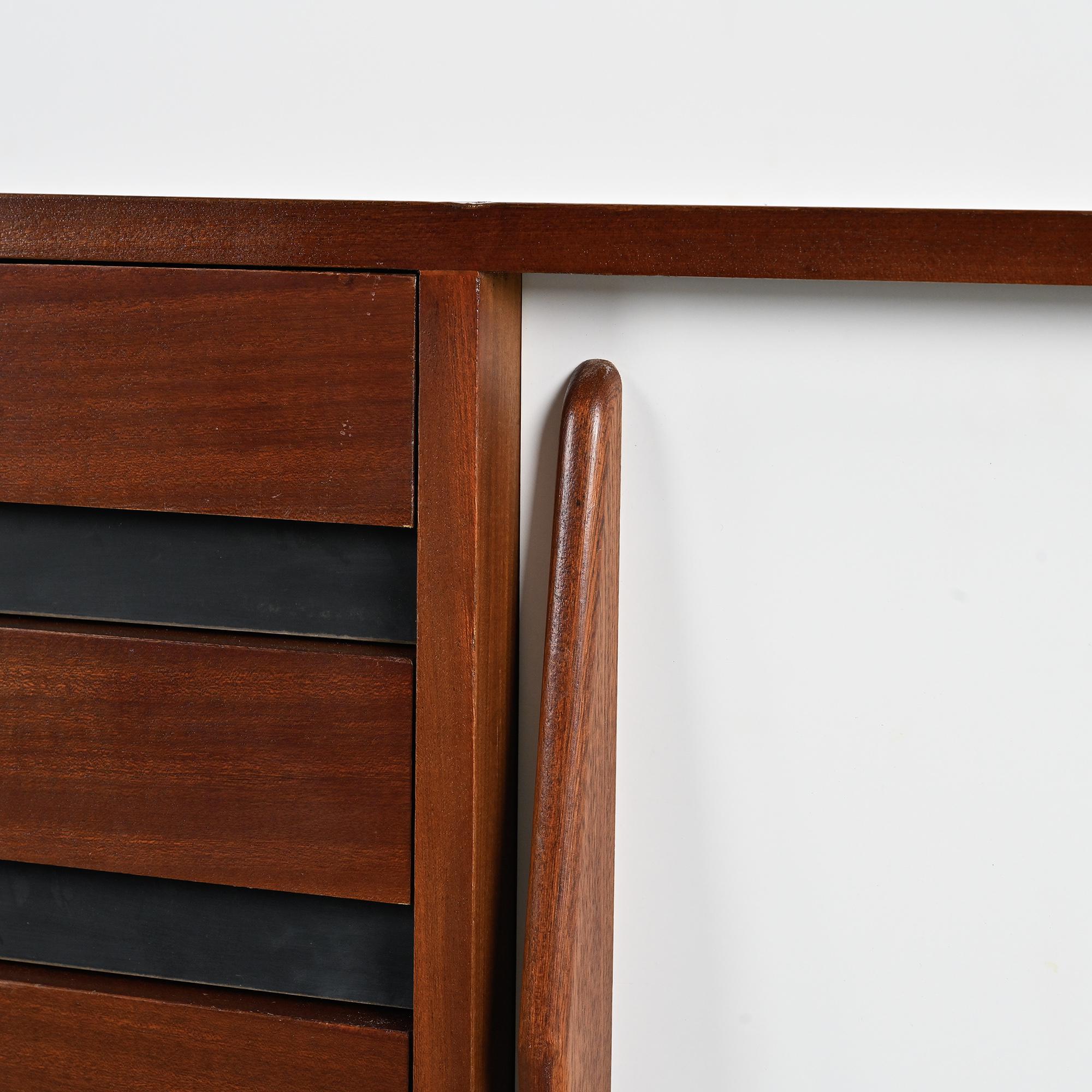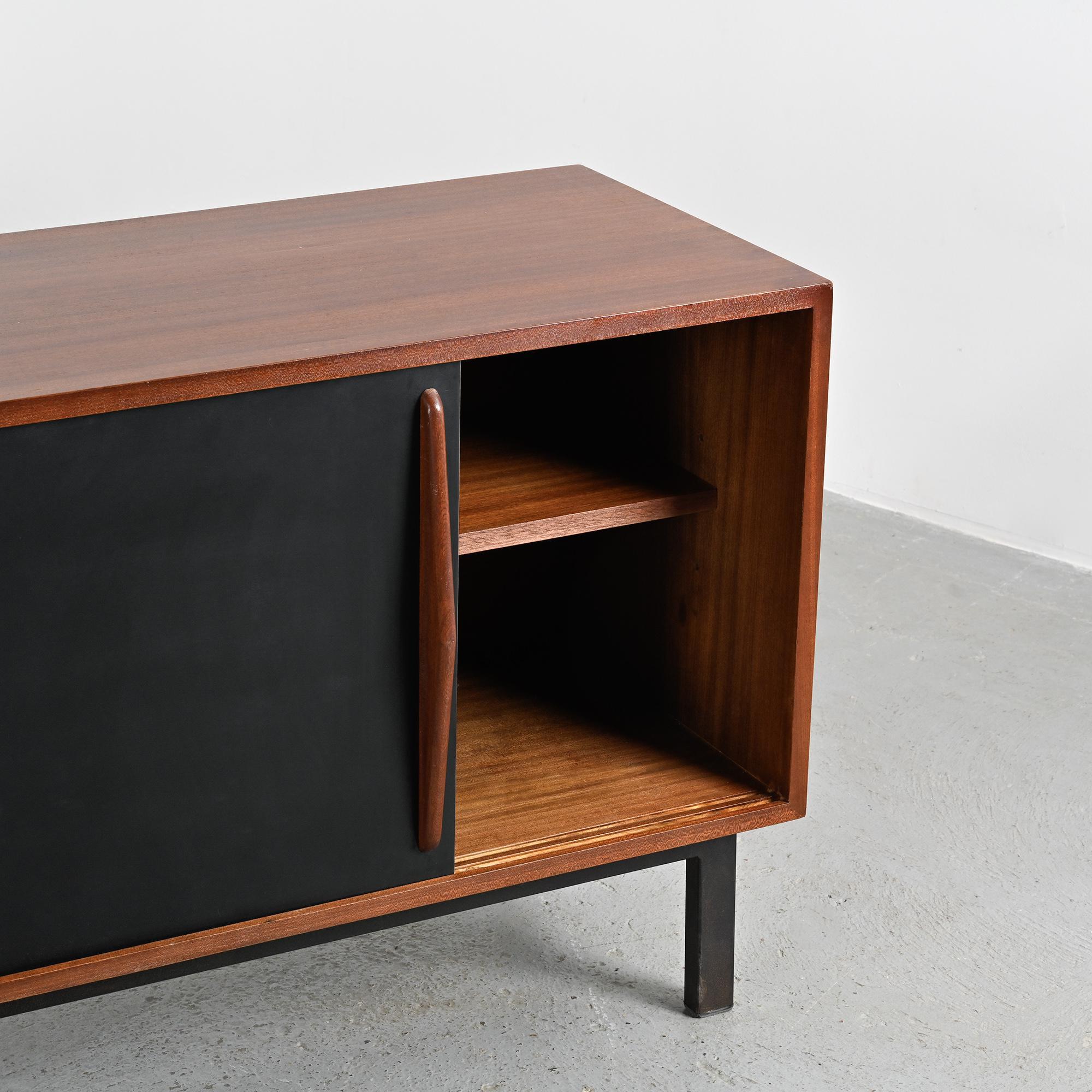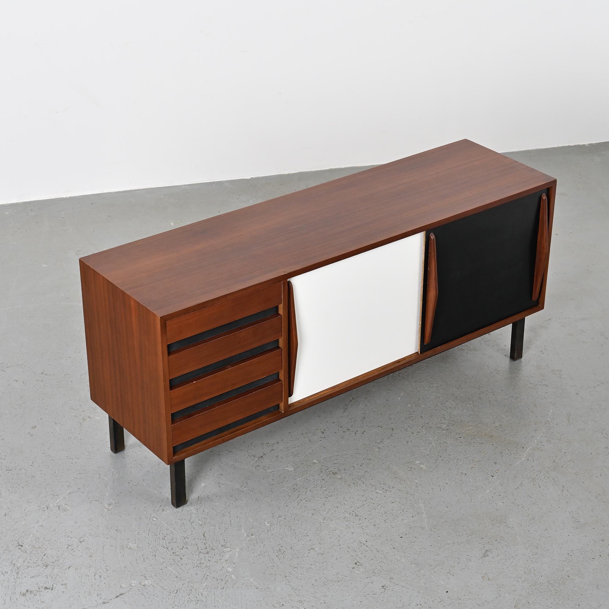 Imaginée pour la ville minière de Cansado en Mauritanie, cette enfilade incarne la rigueur fonctionnelle et l'élégance épurée propres à Charlotte Perriand. Sa structure en placage d'acajou accueille deux portes coulissantes contrastées, l'une blanche, l'autre noire, accompagnées de quatre tiroirs latéraux. L'ensemble repose sur un piétement métallique laqué noir, conférant légèreté et modernité à la pièce.