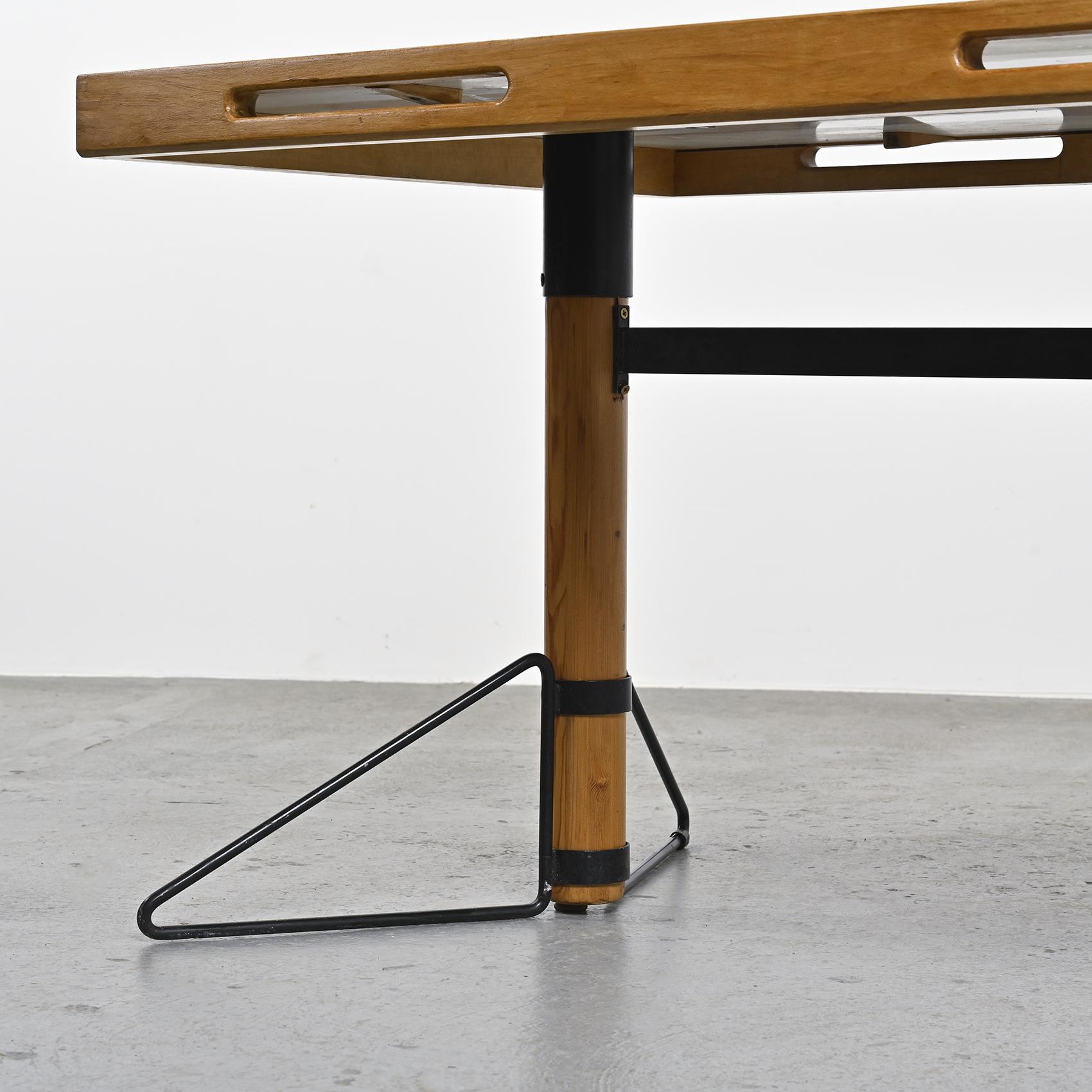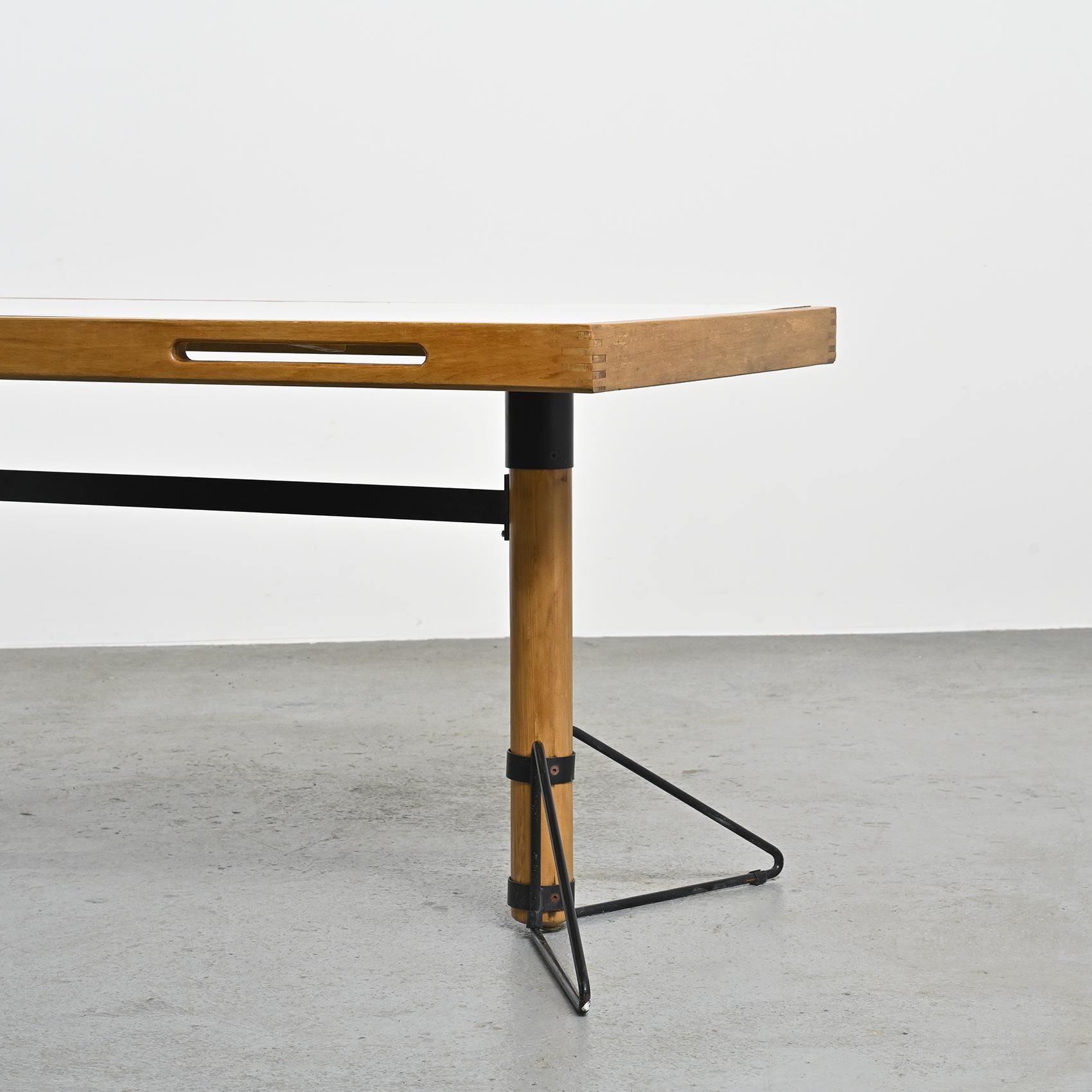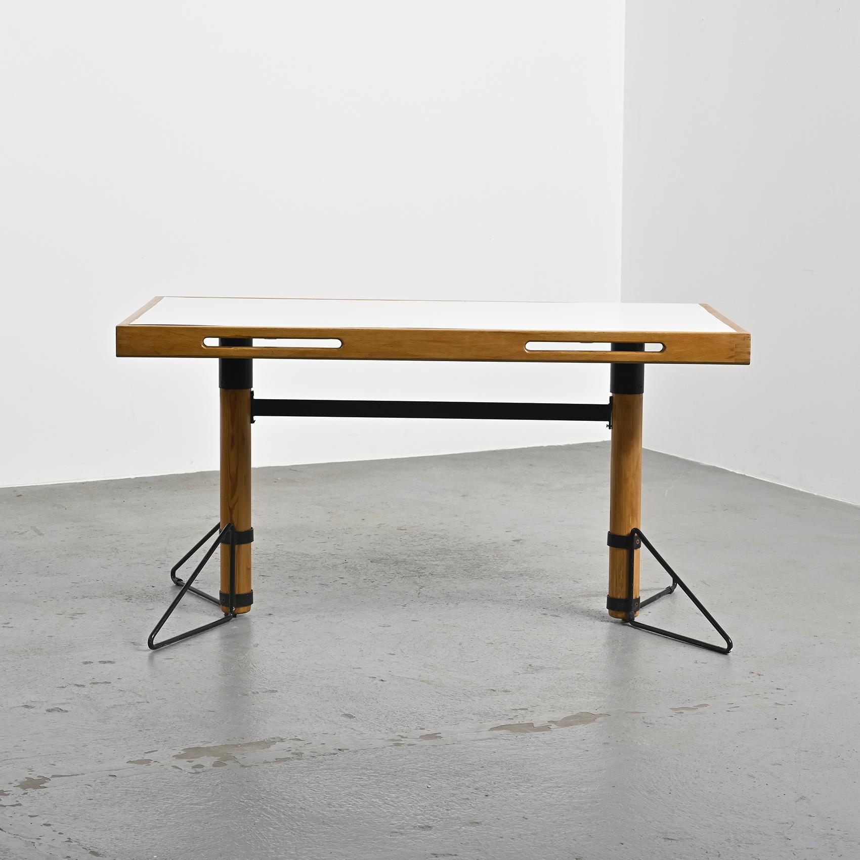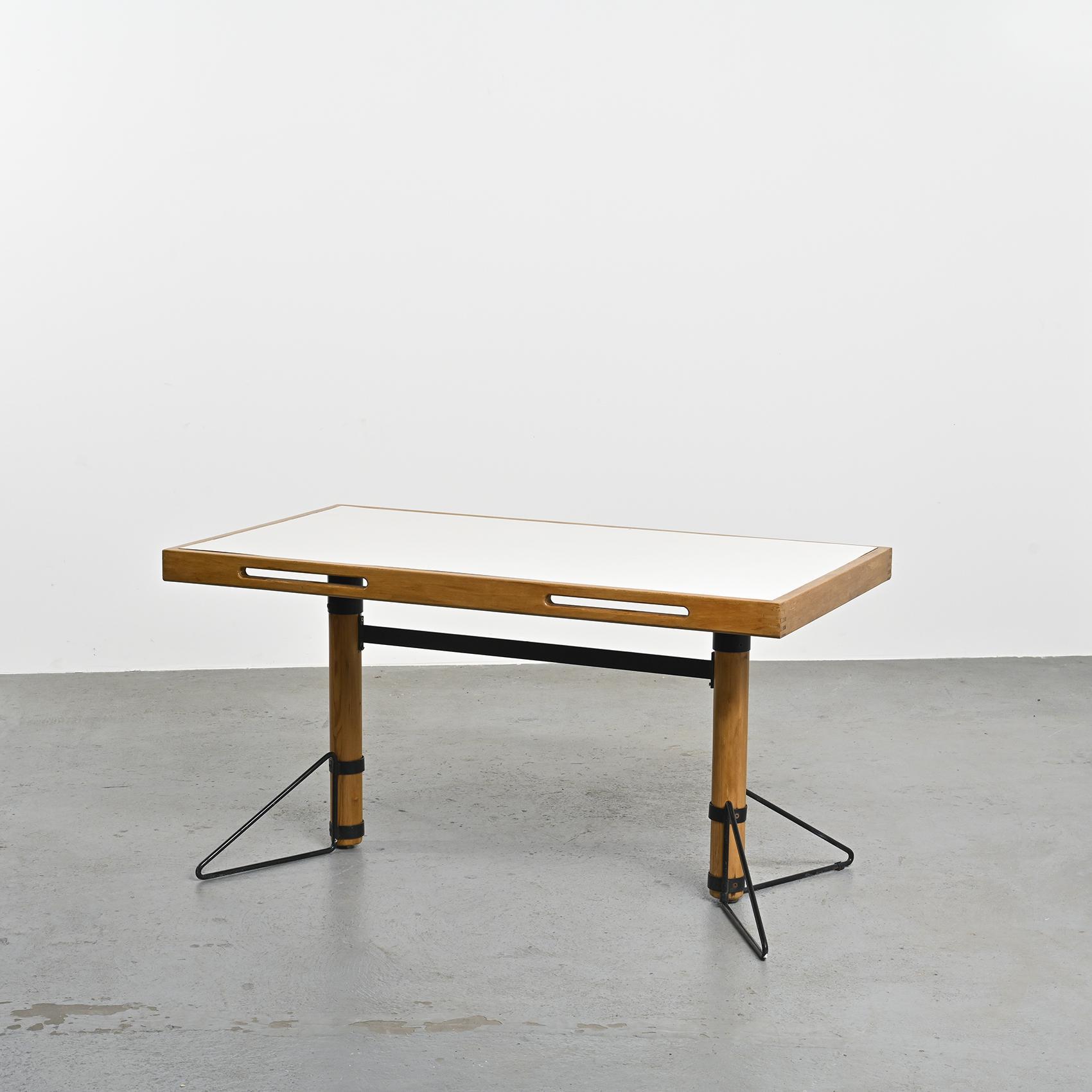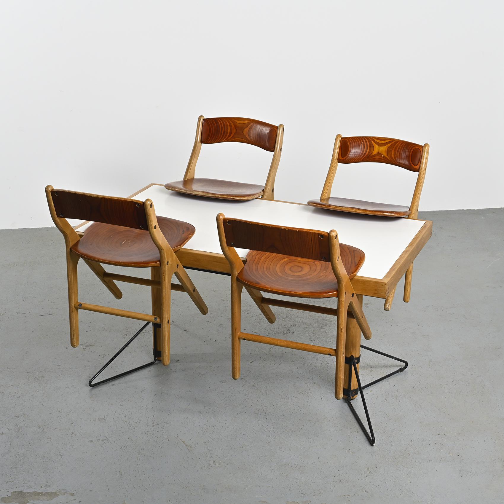 L'ensemble se compose d'une table rectangulaire en mélaminé blanc aux bordures en hêtre massif, reposant sur deux piètements cylindriques en métal laqué noir et hêtre, et de quatre chaises assorties en hêtre et bois exotique moulé façon plywood. Les dossiers arrondis dialoguent avec la rigueur géométrique du plateau. Sous chaque assise, une pièce métallique permet de suspendre les chaises dans les ouvertures ajourées du plateau : un dispositif ingénieux imaginé pour faciliter le nettoyage des sols dans les espaces collectifs, et typique de l'esprit rationnel et fonctionnel de Marc Held.