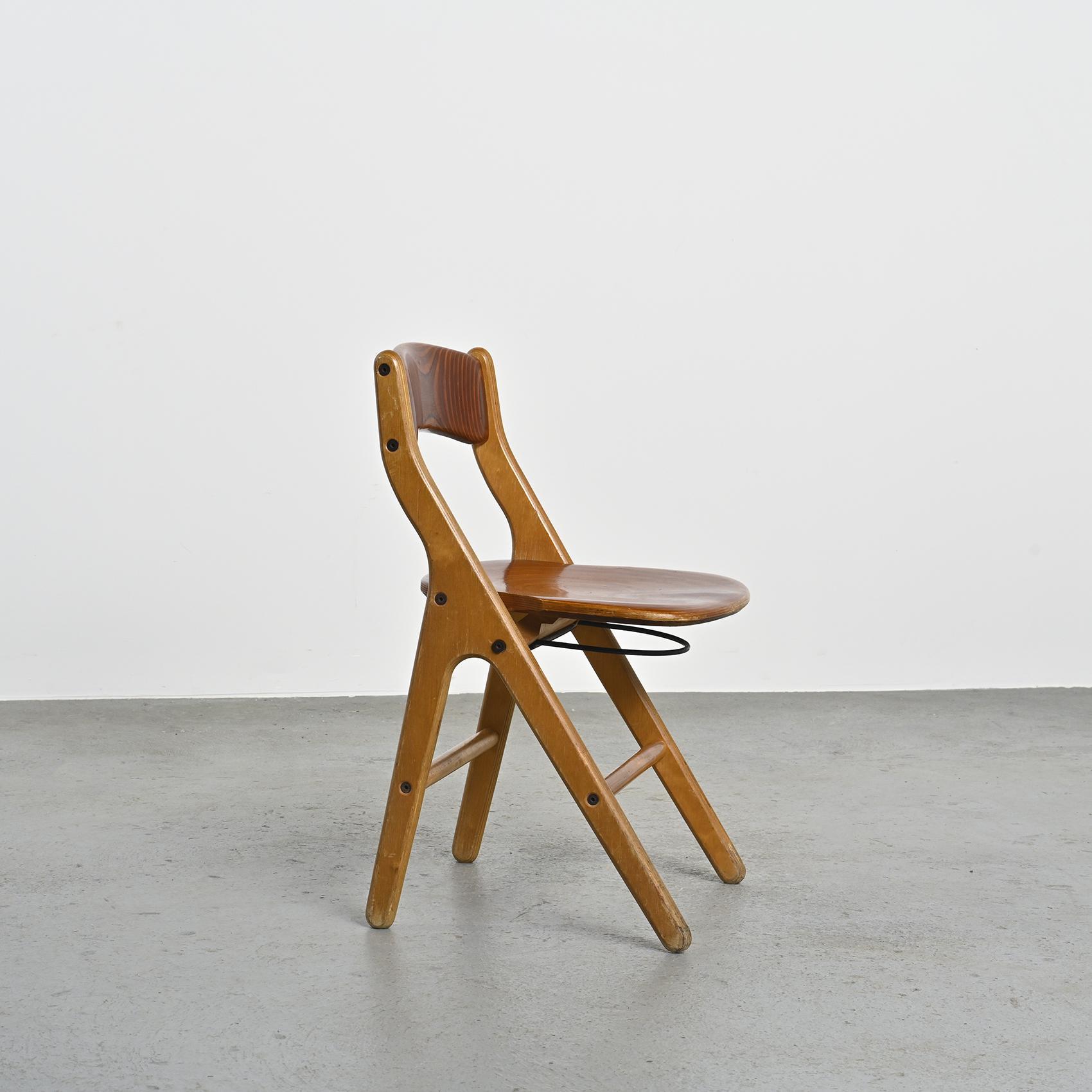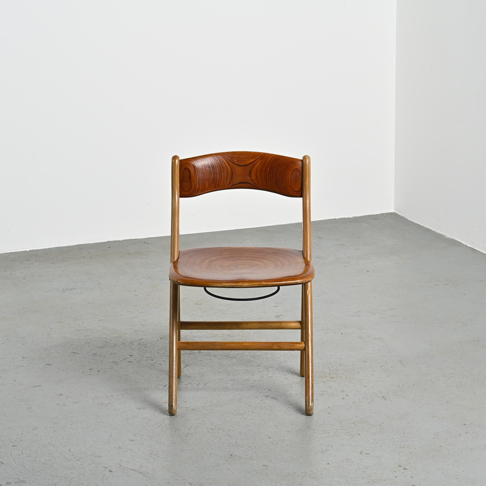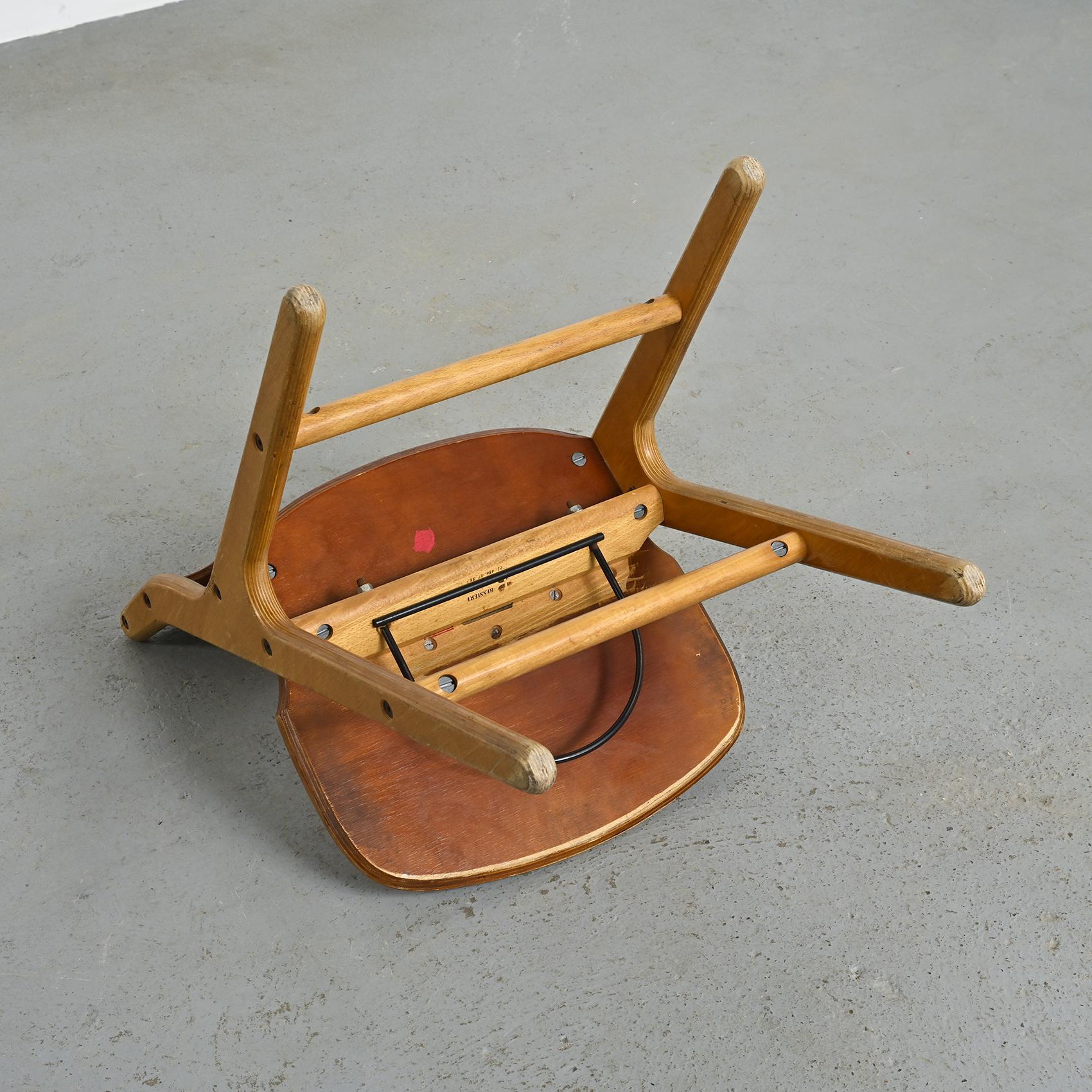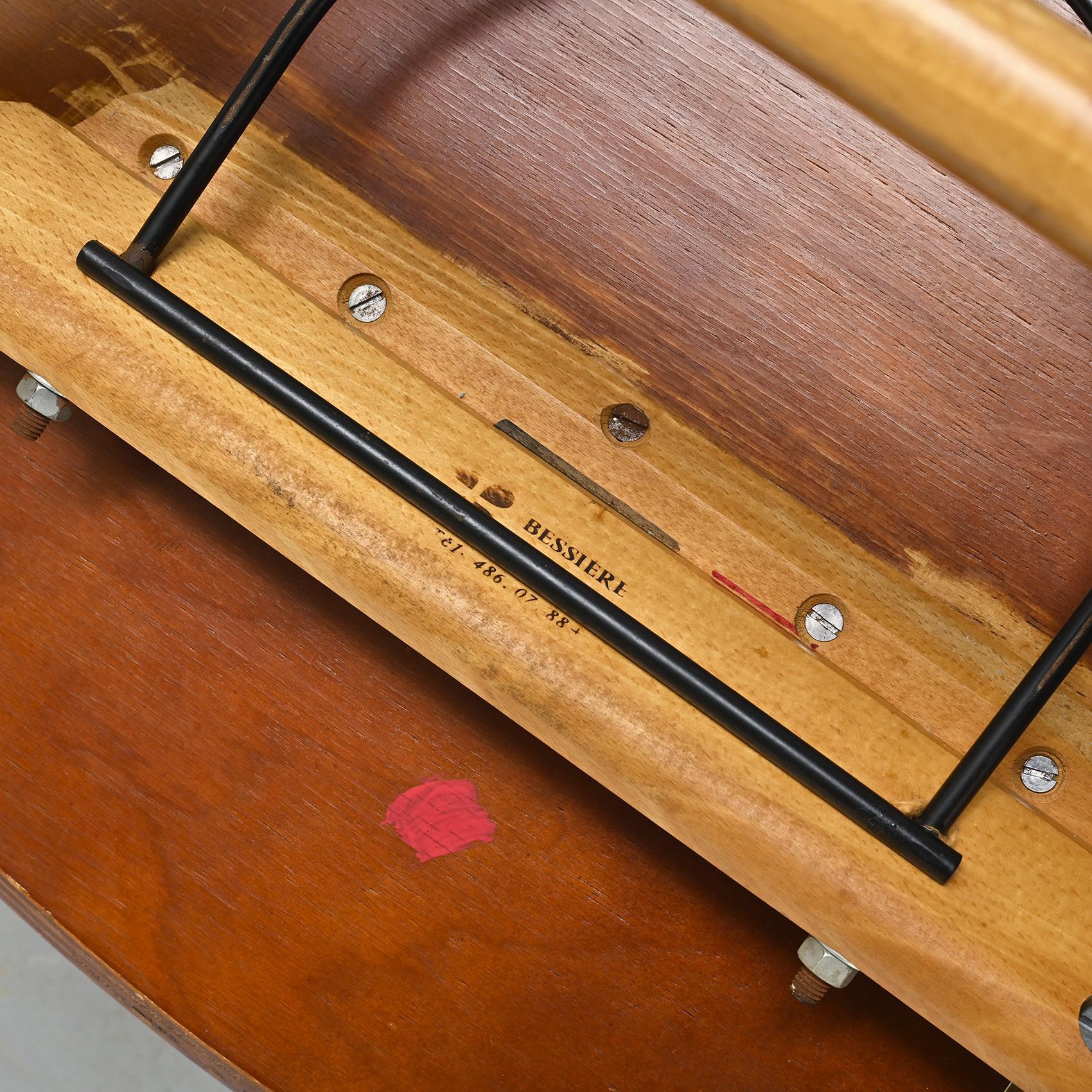 L'ensemble se compose d'une table rectangulaire en mélaminé blanc aux bordures en hêtre massif, reposant sur deux piètements cylindriques en métal laqué noir et hêtre, et de quatre chaises assorties en hêtre et bois exotique moulé façon plywood. Les dossiers arrondis dialoguent avec la rigueur géométrique du plateau. Sous chaque assise, une pièce métallique permet de suspendre les chaises dans les ouvertures ajourées du plateau : un dispositif ingénieux imaginé pour faciliter le nettoyage des sols dans les espaces collectifs, et typique de l'esprit rationnel et fonctionnel de Marc Held.