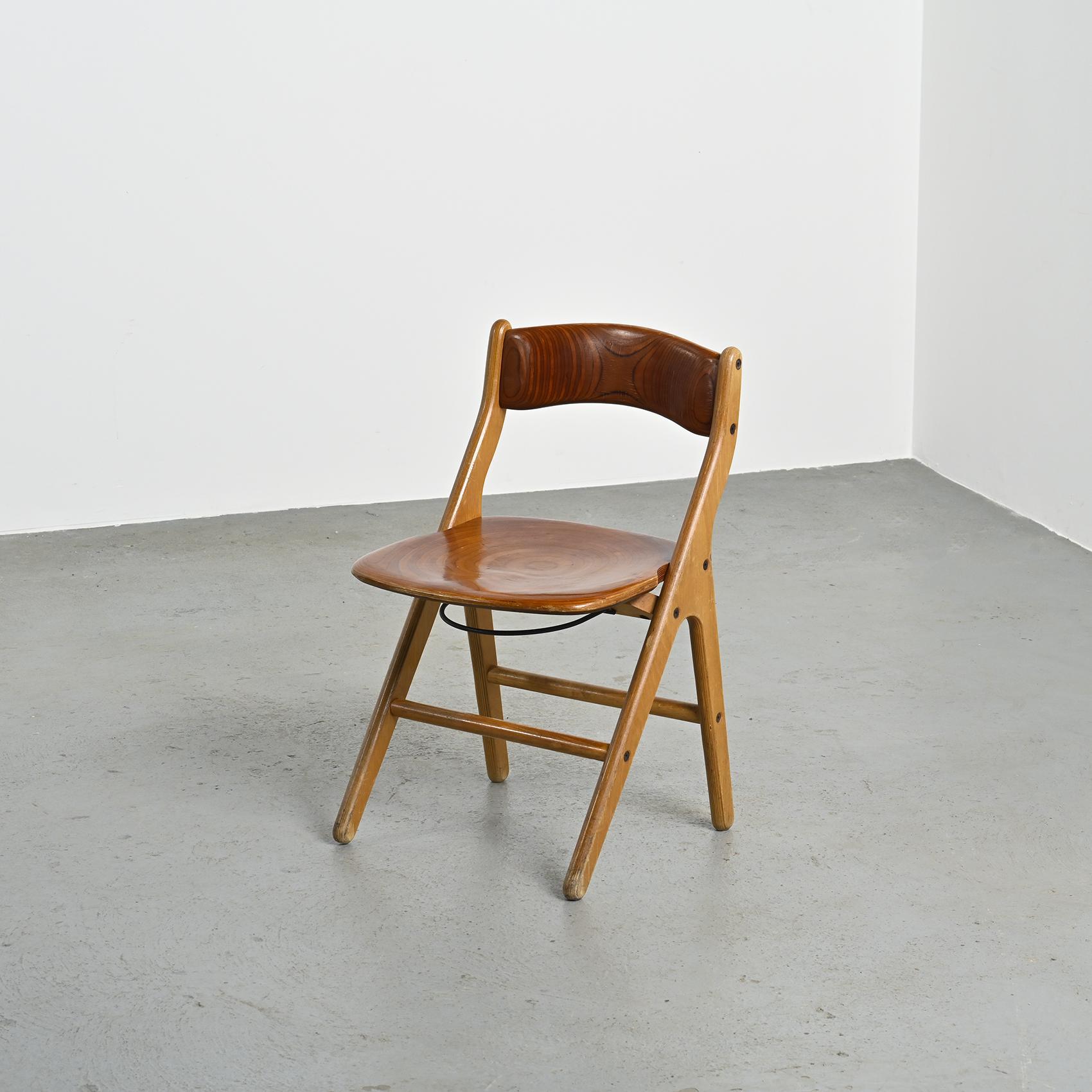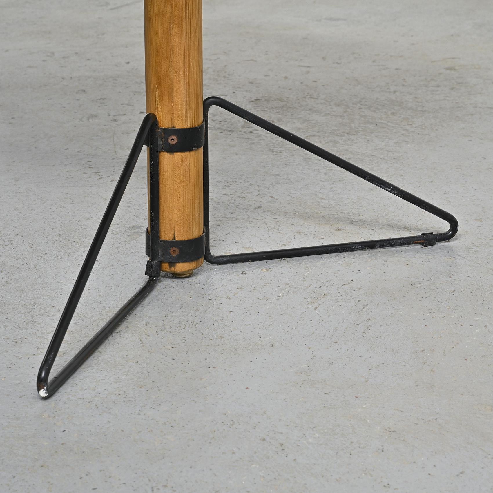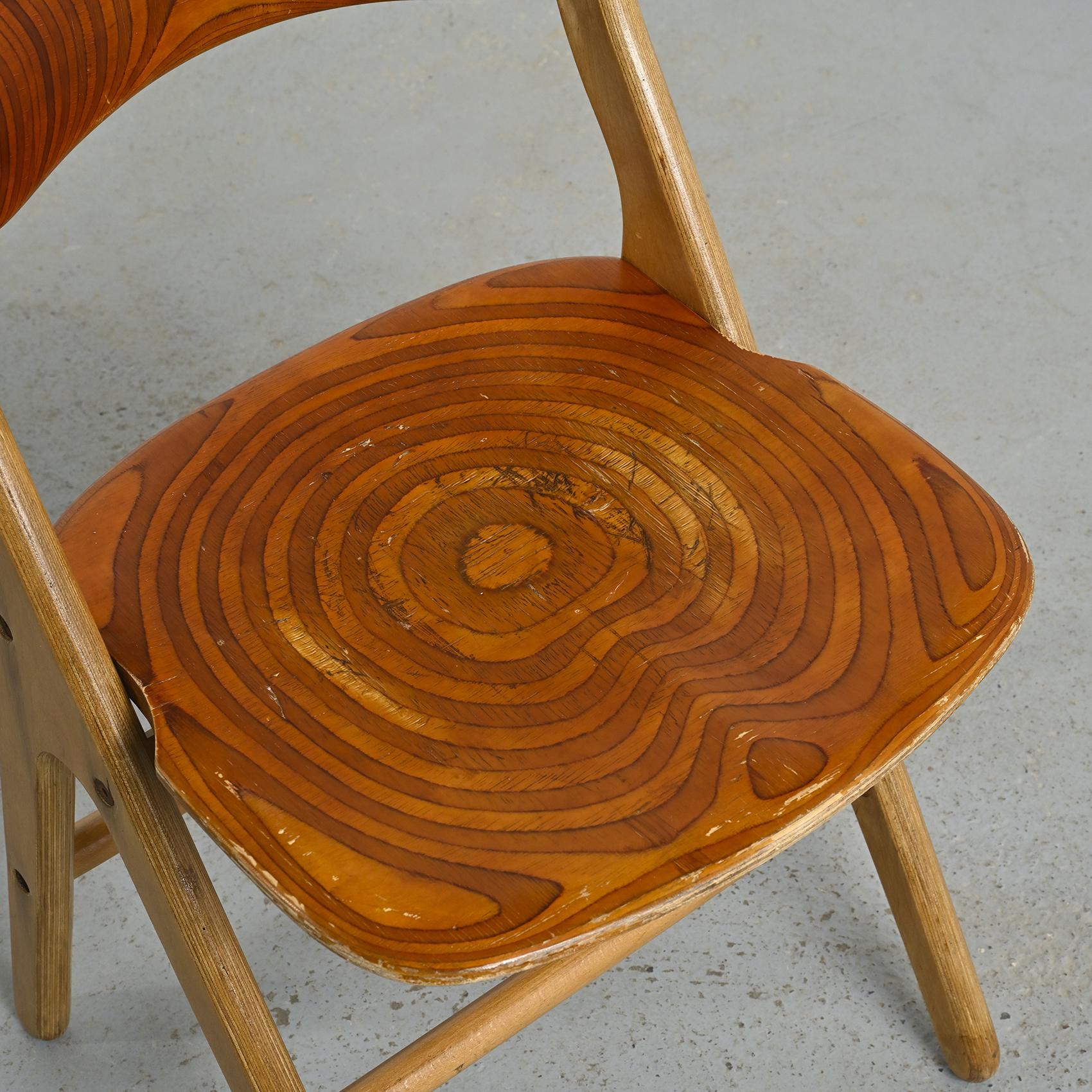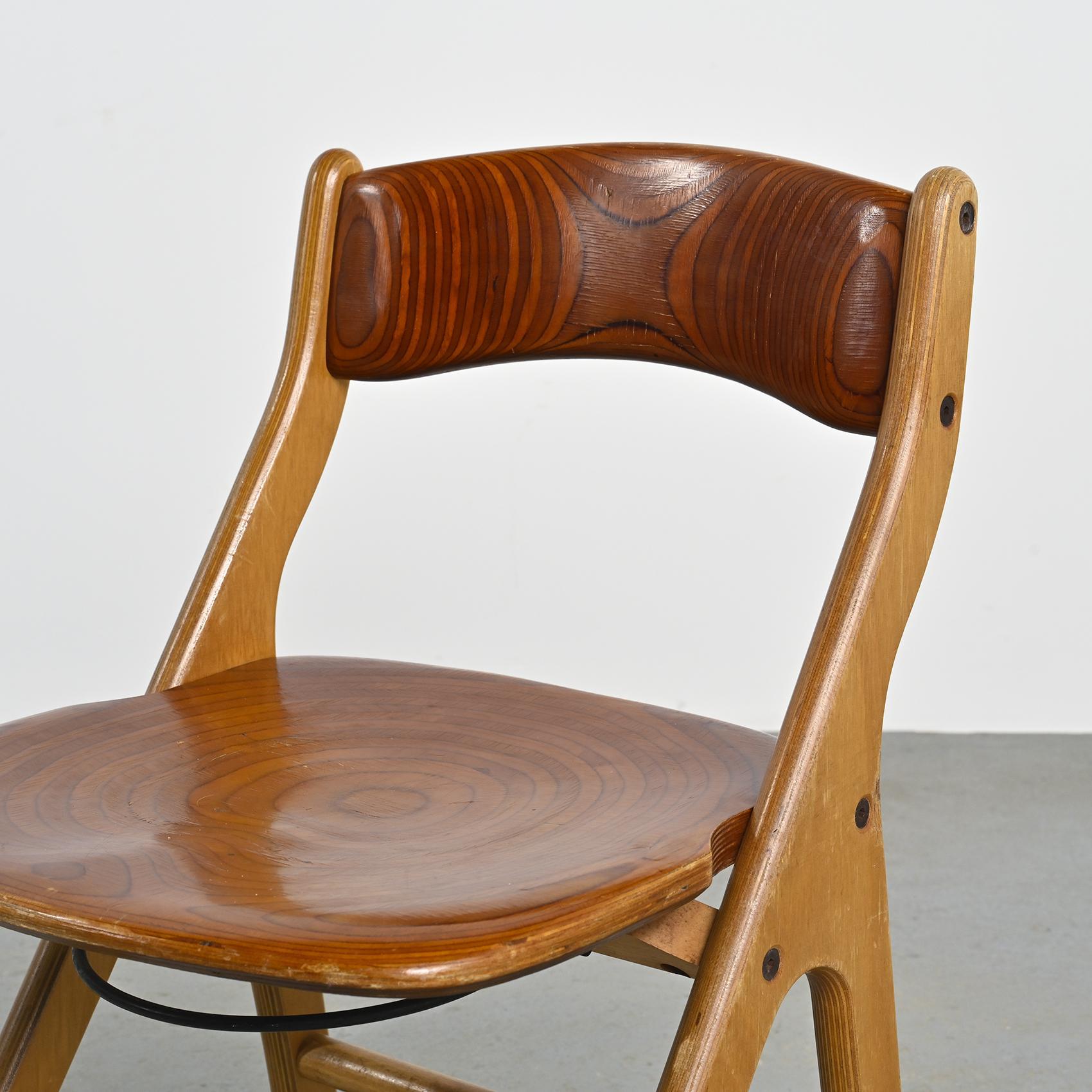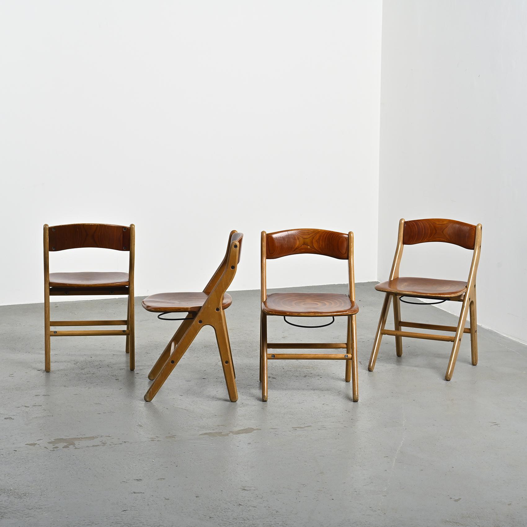 L'ensemble se compose d'une table rectangulaire en mélaminé blanc aux bordures en hêtre massif, reposant sur deux piètements cylindriques en métal laqué noir et hêtre, et de quatre chaises assorties en hêtre et bois exotique moulé façon plywood. Les dossiers arrondis dialoguent avec la rigueur géométrique du plateau. Sous chaque assise, une pièce métallique permet de suspendre les chaises dans les ouvertures ajourées du plateau : un dispositif ingénieux imaginé pour faciliter le nettoyage des sols dans les espaces collectifs, et typique de l'esprit rationnel et fonctionnel de Marc Held.