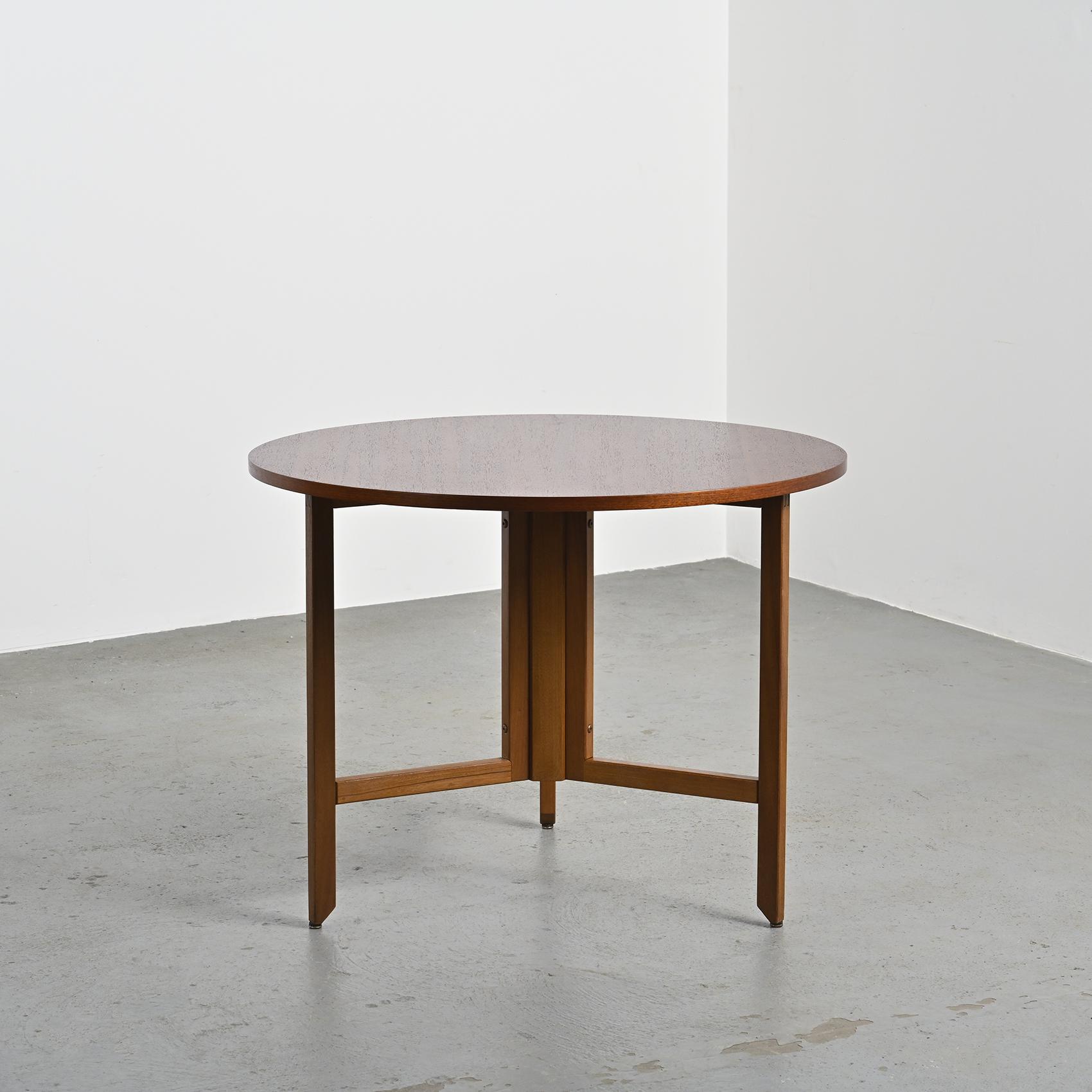 Le plateau circulaire au veinage profond et régulier, repose sur un piètement en acajou massif, assemblé selon la technique brevetée du mobilier à tigettes, véritable signature d'André Sornay. Les assemblages à tenons et mortaises apparents traduisent la précision constructive et la rigueur esthétique du maître, fidèle à sa recherche d'un mobilier à la fois fonctionnel et architectural.
